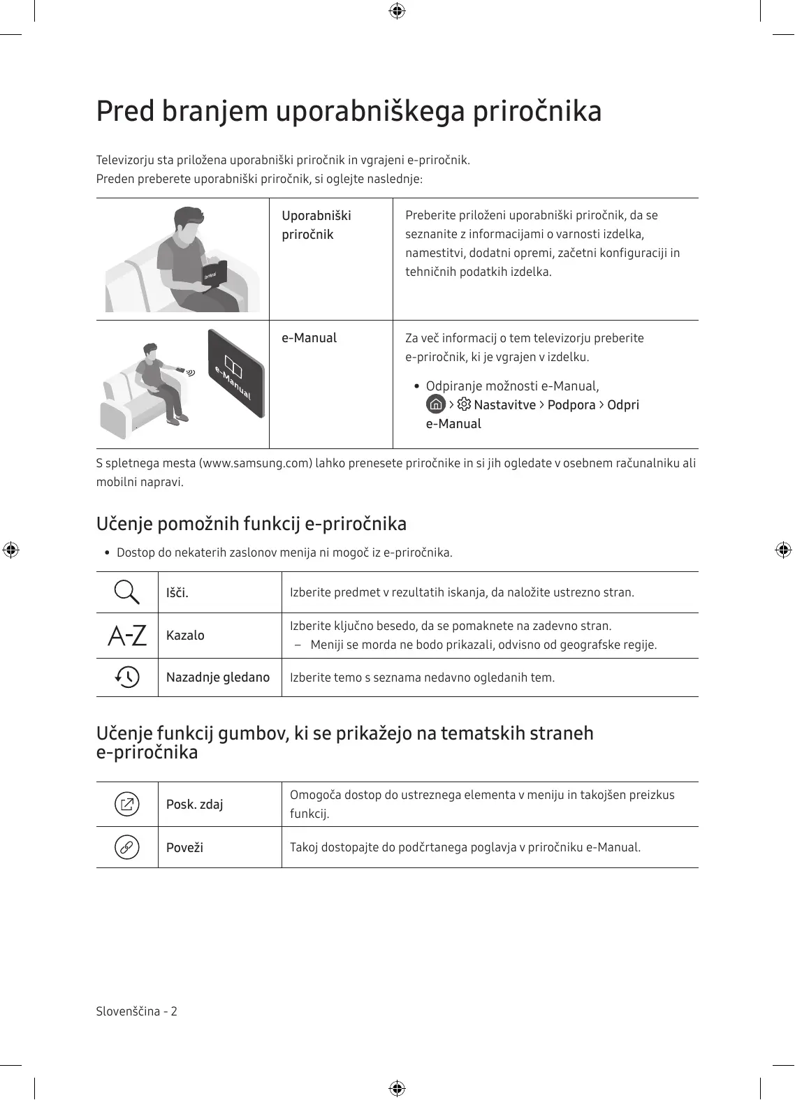 •• Odpiranje možnosti e-Manual, > Nastavitve > Podpora > Odpri e-Manual S spletnega mesta (www.samsung.com) lahko prenesete priročnike in si jih ogledate v osebnem računalniku ali mobilni napravi.