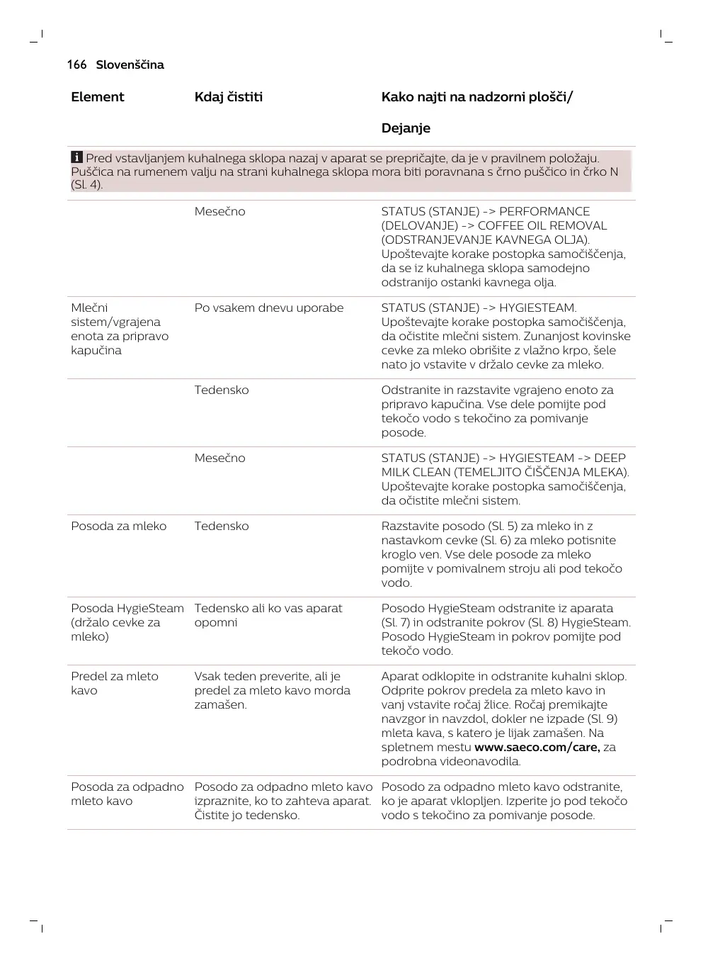 Odpravljanje težav Saeco na več načinov ponuja podporo za reševanje najpogostejših težav, s katerimi se lahko srečate pri uporabi tega aparata: - na nadzorni plošči aparata so na voljo videoposnetki s podrobnimi navodili, - videoposnetke za podporo in izčrpen seznam pogostih vprašanj si lahko ogledate na www.saeco.com/care, - na spletnem mestu www.saeco.com/care je na voljo tudi razširjena različica uporabniškega priročnika.