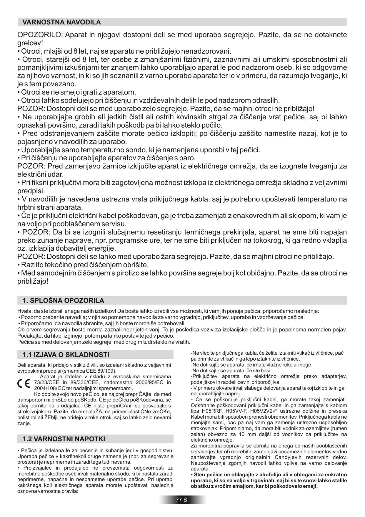 76 CZ VARNOSTNA NAVODILA OPOZORILO: Aparat in njegovi dostopni deli se med uporabo segrejejo. Pazite, da se ne dotaknete grelcev! • Otroci, mlajši od 8 let, naj se aparatu ne približujejo nenadzorovani. • Otroci, starejši od 8 let, ter osebe z zmanjšanimi fizičnimi, zaznavnimi ali umskimi sposobnostmi ali pomanjkljivimi izkušnjami ter znanjem lahko uporabljajo aparat le pod nadzorom oseb, ki so odgovorne za njihovo varnost, in ki so jih seznanili z varno uporabo aparata ter le v primeru, da razumejo tveganje, ki je s tem povezano. • Otroci se ne smejo igrati z aparatom. • Otroci lahko sodelujejo pri čiščenju in vzdrževalnih delih le pod nadzorom odraslih. POZOR: Dostopni deli se med uporabo zelo segrejejo. Pazite, da se majhni otroci ne približajo! • Ne uporabljajte grobih ali jedkih čistil ali ostrih kovinskih strgal za čiščenje vrat pečice, saj bi lahko opraskali površino, zaradi takih poškodb pa bi lahko steklo počilo. • Pred odstranjevanjem zaščite morate pečico izklopiti; po čiščenju zaščito namestite nazaj, kot je to pojasnjeno v navodilih za uporabo. • Uporabljajte samo temperaturno sondo, ki je namenjena uporabi v tej pečici. • Pri čiščenju ne uporabljajte aparatov za čiščenje s paro. POZOR: Pred zamenjavo žarnice izključite aparat iz električnega omrežja, da se izognete tveganju za električni udar. • Pri fiksni priključitvi mora biti zagotovljena možnost izklopa iz električnega omrežja skladno z veljavnimi predpisi. • V navodilih je navedena ustrezna vrsta priključnega kabla, saj je potrebno upoštevati temperaturo na hrbtni strani aparata. • Če je priključni električni kabel poškodovan, ga je treba zamenjati z enakovrednim ali sklopom, ki vam je na voljo pri pooblaščenem servisu. • POZOR: Da bi se izognili slučajnemu resetiranju termičnega prekinjala, aparat ne sme biti napajan preko zunanje naprave, npr. programske ure, ter ne sme biti priključen na tokokrog, ki ga redno vklaplja oz. izklaplja dobavitelj energije. POZOR: Dostopni deli se lahko med uporabo žara segrejejo. Pazite, da se majhni otroci ne približajo. • Razlito tekočino pred čiščenjem obrišite. • Med samodejnim čiščenjem s pirolizo se lahko površina segreje bolj kot običajno. Pazite, da se otroci ne približajo! 1. SPLOŠNA OPOZORILA Hvala, da ste izbrali enega naših izdelkov! Da boste lahko izrabili vse možnosti, ki vam jih ponuja pečica, priporočamo naslednje: • Pozorno preberite navodila; v njih so pomembna navodila za varno vgradnjo, priključitev, uporabo in vzdrževanje pečice. • Priporočamo, da navodila shranite, saj jih boste morda še potrebovali. Ob prvem segrevanju boste morda zaznali neprijeten vonj. To je posledica veziv za izolacijske plošče in je popolnoma normalen pojav. Počakajte, da hlapi izginejo, potem pa lahko postavite jed v pečico. Pečica se med delovanjem zelo segreje, med drugim tudi steklo na vratih. -Ne vlecite priključnega kabla, če želite iztakniti vtikač iz vtičnice, pač pa primite za vtikač in ga lepo iztaknite iz vtičnice. -Ne dotikajte se aparata, če imate vlažne roke ali noge. -Ne dotikajte se aparata, če ste bosi. -Priključitev aparata na električno omrežje preko adapterjev, podaljškov in razdelilcev ni priporočljiva. - V primeru okvare in/ali slabega delovanja aparat takoj izklopite in ga ne uporabljajte naprej. - Če se poškoduje priključni kabel, ga morate takoj zamenjati. Odstranite poškodovani priključni kabel in ga zamenjajte s kablom tipa H05RRF, H05VV-F, H05V2V2-F ustrezne dolžine in preseka Kabel mora biti sposoben prenesti obremenitev. Priključnega kabla ne menjajte sami, pač pa naj vam ga zamenja ustrezno usposobljen strokovnjak! Pripominjamo, da mora biti vodnik za ozemljitev (rumen zelen) obvezno za 10 mm daljši od vodnikov za priključitev na električno omrežje. Za morebitna popravila se obrnite na enega od naših pooblaščenih serviserjev ter ob morebitni zamenjavi posameznih elementov vedno zahtevajte vgradnjo originalnih Candyjevih rezervnih delov. Neupoštevanje zgornjih navodil lahko vpliva na varno delovanje aparata. • Sten pečice ne oblagajte z alu-folijo ali v oblogami za enkratno uporabo, ki so na voljo v trgovinah, saj bi se te snovi lahko stalile ob stiku z vročim emajlom, kar bi poškodovalo emajl.
