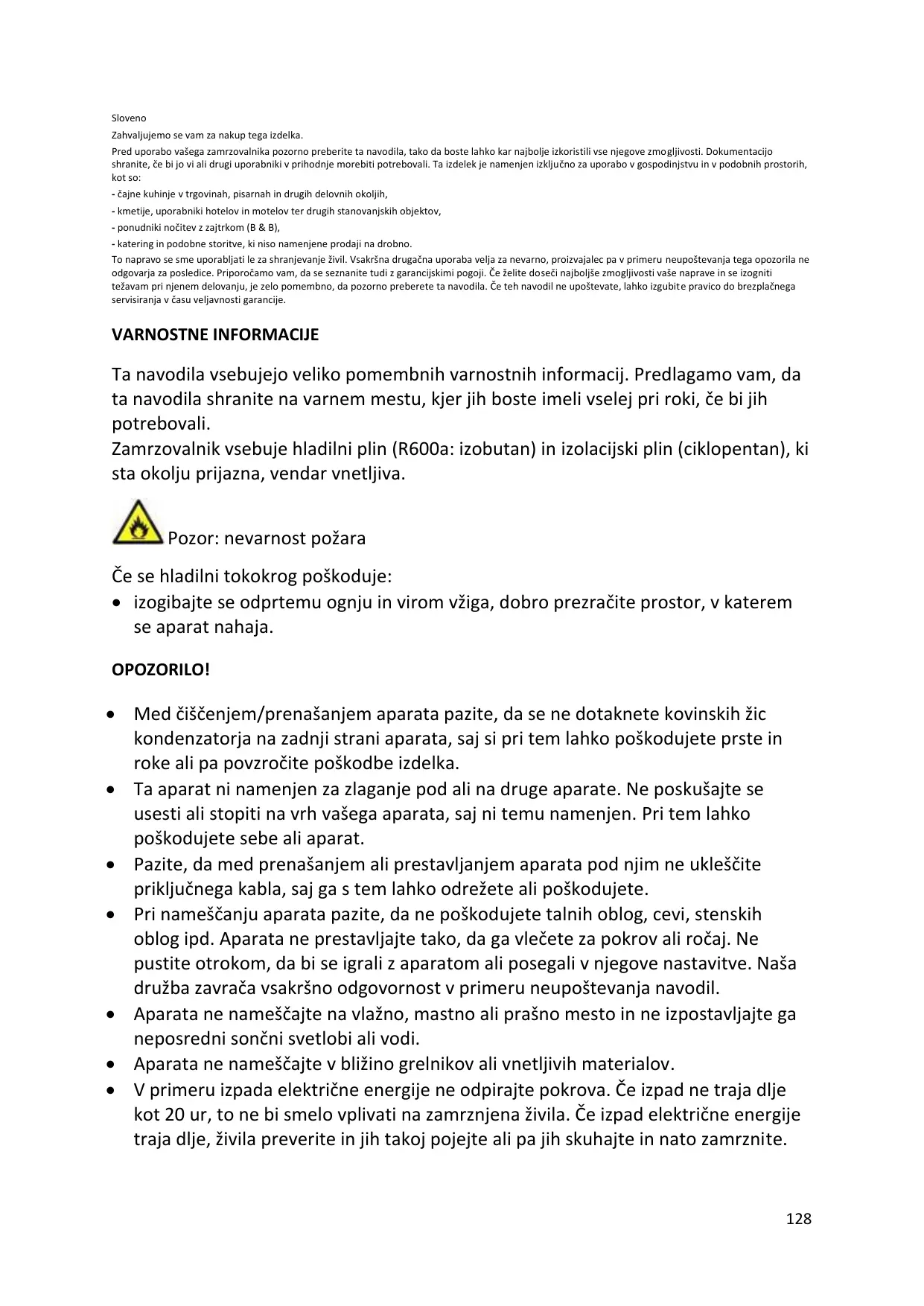 Sloveno Zahvaljujemo se vam za nakup tega izdelka. Pred uporabo vašega zamrzovalnika pozorno preberite ta navodila, tako da boste lahko kar najbolje izkoristili vse njegove zmogljivosti. Dokumentacijo shranite, če bi jo vi ali drugi uporabniki v prihodnje morebiti potrebovali. Ta izdelek je namenjen izključno za uporabo v gospodinjstvu in v podobnih prostorih, kot so: - čajne kuhinje v trgovinah, pisarnah in drugih delovnih okoljih, - kmetije, uporabniki hotelov in motelov ter drugih stanovanjskih objektov, - ponudniki nočitev z zajtrkom (B & B), - katering in podobne storitve, ki niso namenjene prodaji na drobno. To napravo se sme uporabljati le za shranjevanje živil. Vsakršna drugačna uporaba velja za nevarno, proizvajalec pa v primeru neupoštevanja tega opozorila ne odgovarja za posledice. Priporočamo vam, da se seznanite tudi z garancijskimi pogoji. Če želite doseči najboljše zmogljivosti vaše naprave in se izogniti težavam pri njenem delovanju, je zelo pomembno, da pozorno preberete ta navodila. Če teh navodil ne upoštevate, lahko izgubite pravico do brezplačnega servisiranja v času veljavnosti garancije. VARNOSTNE INFORMACIJE Ta navodila vsebujejo veliko pomembnih varnostnih informacij. Predlagamo vam, da ta navodila shranite na varnem mestu, kjer jih boste imeli vselej pri roki, če bi jih potrebovali. Zamrzovalnik vsebuje hladilni plin (R600a: izobutan) in izolacijski plin (ciklopentan), ki sta okolju prijazna, vendar vnetljiva. Pozor: nevarnost požara Če se hladilni tokokrog poškoduje: