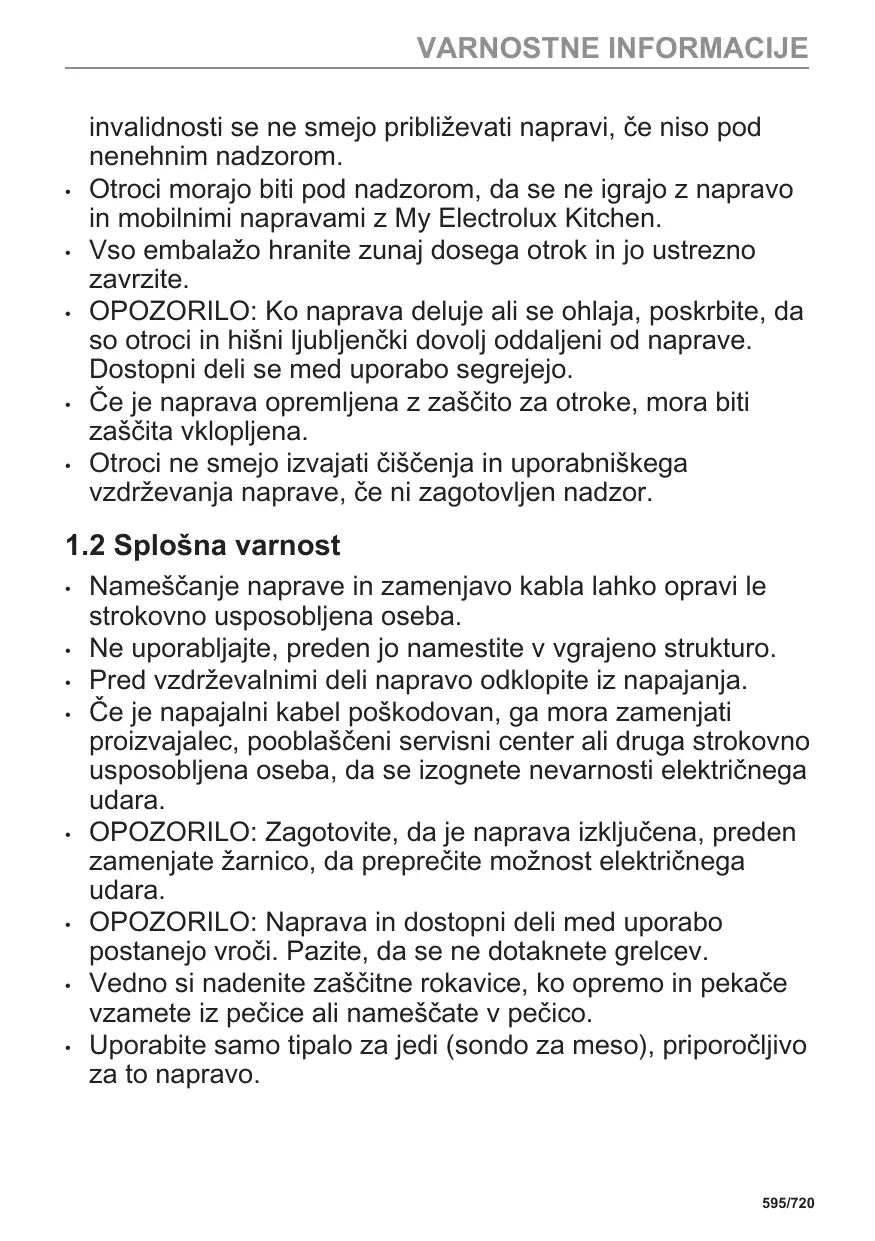 invalidnosti se ne smejo približevati napravi, če niso pod nenehnim nadzorom. Otroci morajo biti pod nadzorom, da se ne igrajo z napravo in mobilnimi napravami z My Electrolux Kitchen. Vso embalažo hranite zunaj dosega otrok in jo ustrezno zavrzite. OPOZORILO: Ko naprava deluje ali se ohlaja, poskrbite, da so otroci in hišni ljubljenčki dovolj oddaljeni od naprave. Dostopni deli se med uporabo segrejejo. Če je naprava opremljena z zaščito za otroke, mora biti zaščita vklopljena. Otroci ne smejo izvajati čiščenja in uporabniškega vzdrževanja naprave, če ni zagotovljen nadzor.