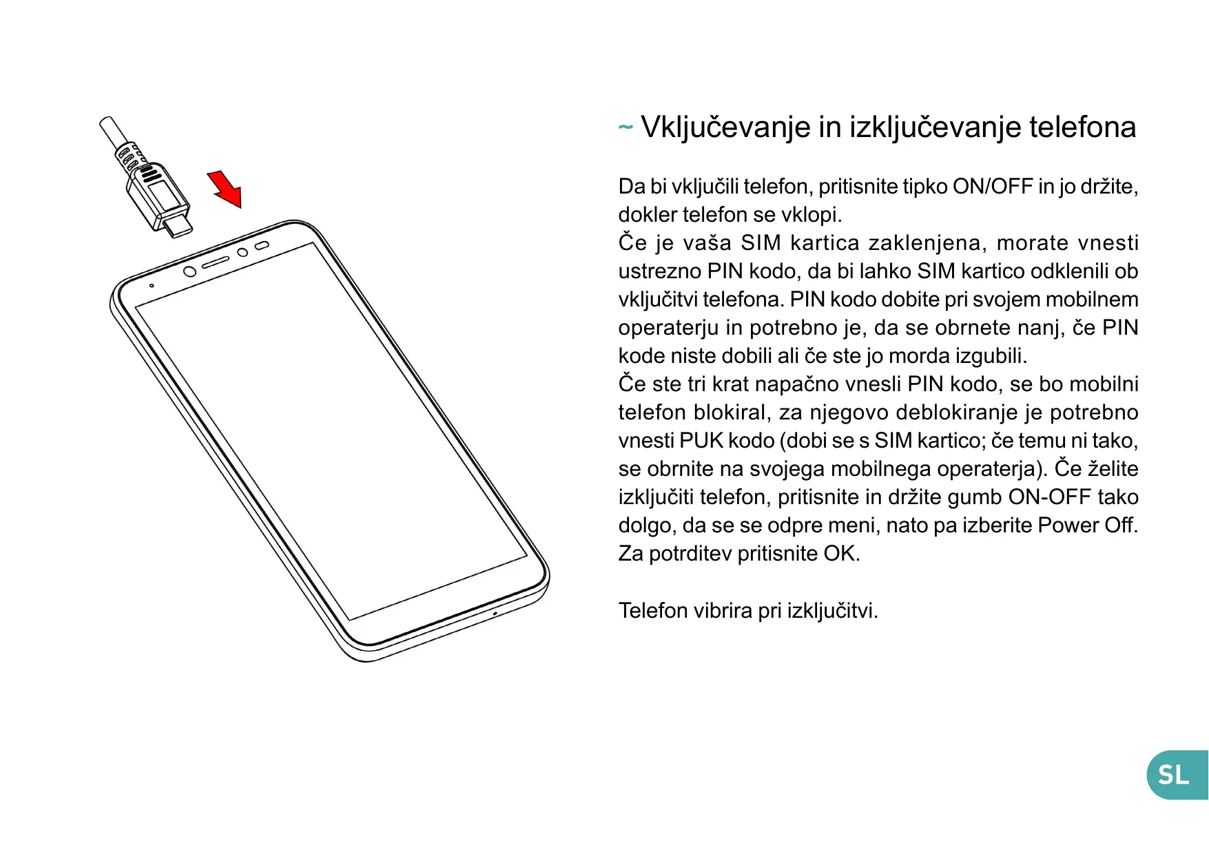 ~ Vključevanje in izključevanje telefona Da bi vključili telefon, pritisnite tipko ON/OFF in jo držite, dokler telefon se vklopi. Če je vaša SIM kartica zaklenjena, morate vnesti ustrezno PIN kodo, da bi lahko SIM kartico odklenili ob vključitvi telefona. PIN kodo dobite pri svojem mobilnem operaterju in potrebno je, da se obrnete nanj, če PIN kode niste dobili ali če ste jo morda izgubili. Če ste tri krat napačno vnesli PIN kodo, se bo mobilni telefon blokiral, za njegovo deblokiranje je potrebno vnesti PUK kodo (dobi se s SIM kartico; če temu ni tako, se obrnite na svojega mobilnega operaterja). Če želite izključiti telefon, pritisnite in držite gumb ON-OFF tako dolgo, da se se odpre meni, nato pa izberite Power Off. Za potrditev pritisnite OK. Telefon vibrira pri izključitvi.
