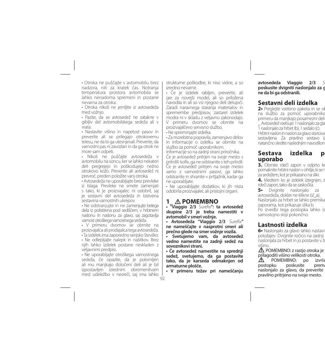 e attentivement les instructions nt l'utilisation et bien les server pour les consulter rieurement. Le non-respect des uctions pour l'installation du e-auto, entraînerait des risques r votre bébé. s opérations de montage et tallation de Viaggio 2/3 Surefix ent être effectuées par des es. L'opération de montage et stallation doit être effectuée l'enfant dans le siège-auto. ndant les voyages en voiture, ne is tenir le bébé dans ses bras, et ne is l'installer en dehors du siège. En e freinage brusque, même à faible e, l'enfant pourrait facilement être pulté vers l'avant. er d'introduire les doigts dans les anismes. voiture faire très attention aux ges ou autres objets qui pourraient er des lésions à l'enfant dans le e-auto en cas d'accident.