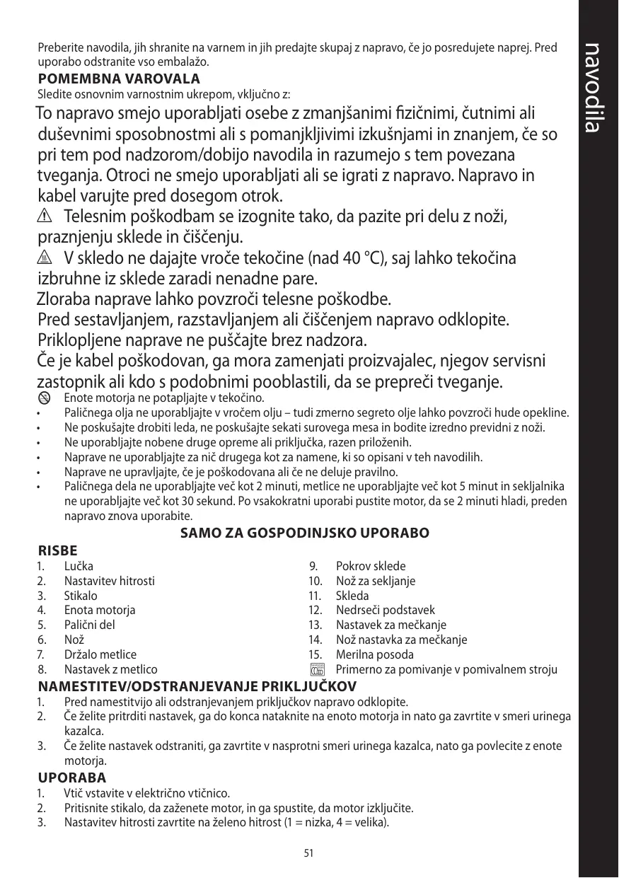 • N’essayez pas de piler de la glace ou de hacher de la viande crue et faites attention aux lames. N’adaptez pas d’accessoires autres que ceux fournis. N’utilisez pas l’appareil à d’autres fins que celles décrites dans ce mode d’emploi. N’utilisez pas l’appareil s’il est endommagé ou s’il ne fonctionne pas correctement. Ne pas utiliser le batteur pendant plus de 2 minutes, le fouet pendant plus de 5 minutes, le hachoir pendant plus de 30 secondes. Laissez le moteur refroidir pendant 2 minutes avant d’utiliser à nouveau ces accessoires.