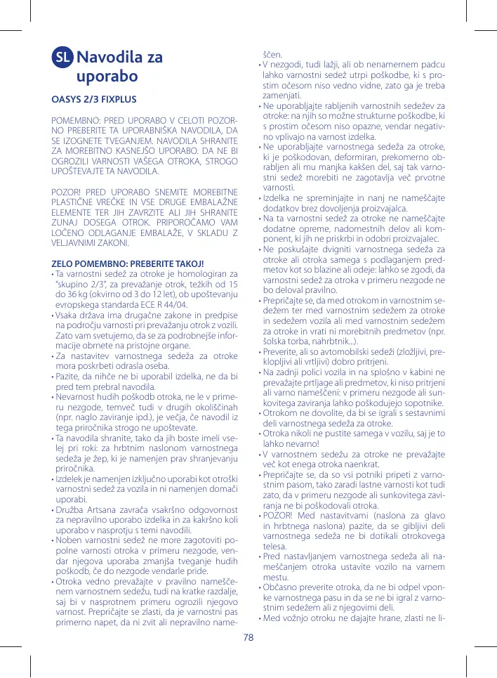 LIRE ATTENTIVEMENT ET ENTIÈREMENT CETTE NOTICE POUR ÉVITER TOUT DANGER ET LA CONSERVER POUR TOUTE RÉFÉRENCE FUTURE. POUR NE PAS COMPROMETTRE LA SÉCURITÉ DE VOTRE ENFANT, SUIVEZ ATTENTIVEMENT CES INSTRUCTIONS. ATTENTION ! AVANT D’UTILISER LE PRODUIT, ÔTER ET ÉLIMINER TOUS LES SACHETS EN PLASTIQUE ÉVENTUELS ET TOUS LES ÉLÉMENTS COMPOSANT L’EMBALLAGE DU PRODUIT ET LES TENIR HORS DE PORTÉE DES ENFANTS. IL EST CONSEILLÉ D’ÉLIMINER CES ÉLÉMENTS EN FAISANT LE TRI SÉLECTIF CONFORMÉMENT AUX LOIS EN VIGUEUR. TRÈS IMPORTANT ! À LIRE IMMÉDIATEMENT • Ce siège-auto est homologué “Groupe 2/3”, pour le transport d’enfants de 15 à 36 Kg (de 3 à 12 ans de façon indicative), conformément au règlement européen ECE R 44/04. • Chaque pays applique des lois et des règlements différents en matière de sécurité pour le transport des enfants en voiture. C’est pourquoi il est conseillé de contacter les autorités locales pour obtenir davantage d’informations. • Les activités de réglage du siège-auto doivent être effectuées exclusivement par un adulte. • Éviter que quiconque utilise le produit sans avoir lu la notice. • Le risque de blessures de l’enfant, non seulement en cas d’accident mais aussi dans d’autres circonstances (par ex. freinages brusques, etc.) augmente si les indications de cette notice ne sont pas suivies scrupuleusement. • Conserver la Notice pour toute référence future : une poche permettant de ranger la notice se trouve derrière le dossier du siège auto. • Le produit doit être utilisé exclusivement comme siège-auto et ne doit pas être utilisé à la maison. • La société Artsana décline toute responsabilité en cas d’utilisation incorrecte du produit et pour toute utilisation différente de cette notice. • Aucun siège-auto ne peut garantir la sécurité totale de l’enfant en cas d’accident, mais son utilisation réduit le risque de blessures graves. • Transporter un enfant dans un siège-auto correctement installé, même lors de trajets brefs ; dans le cas contraire, cela pourrait nuire à sa sécurité. Vérifier notamment que la ceinture est correcte-