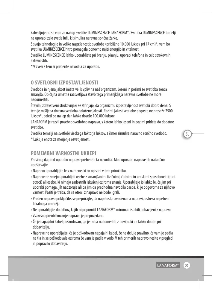 Zahvaljujemo se vam za nakup svetilke LUMINESCENCE LANAFORM®. Svetilka LUMINESCENCE temelji na uporabi zelo svetle luči, ki simulira naravne sončne žarke. S svojo tehnologijo in veliko razpršenostjo svetlobe (približno 10.000 luksov pri 17 cm)*, vam bo svetilka LUMINESCENCE hitro pomagala ponovno najti energijo in vitalnost. Svetilko LUMINESCENCE lahko uporabljate pri branju, pisanju, uporabi telefona in celo strokovnih aktivnostih. * V zvezi s tem si preberite navodila za uporabo.