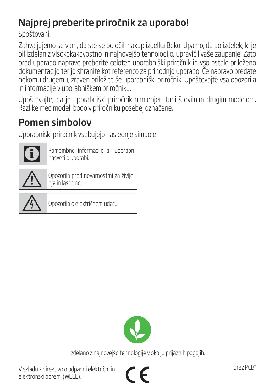 127 / IT Najprej preberite priročnik za uporabo! Spoštovani, Zahvaljujemo se vam, da ste se odločili nakup izdelka Beko. Upamo, da bo izdelek, ki je bil izdelan z visokokakovostno in najnovejšo tehnologijo, upravičil vaše zaupanje. Zato pred uporabo naprave preberite celoten uporabniški priročnik in vso ostalo priloženo dokumentacijo ter jo shranite kot referenco za prihodnjo uporabo. Če napravo predate nekomu drugemu, zraven priložite še uporabniški priročnik. Upoštevajte vsa opozorila in informacije v uporabniškem priročniku. Upoštevajte, da je uporabniški priročnik namenjen tudi številnim drugim modelom. Razlike med modeli bodo v priročniku posebej označene.