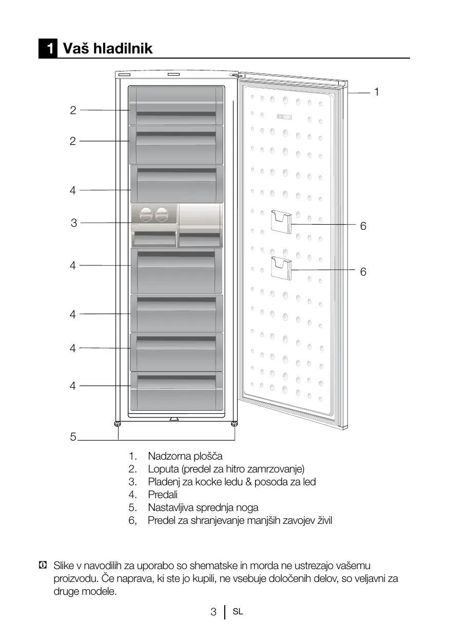 5 1. Nadzorna plošča 2. Loputa (predel za hitro zamrzovanje) 3. Pladenj za kocke ledu & posoda za led 4. Predali 5. Nastavljiva sprednja noga 6, Predel za shranjevanje manjših zavojev živil