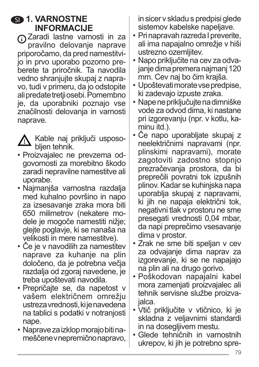 in sicer v skladu s predpisi glede sistemov kabelske napeljave. Pri napravah razreda I preverite, ali ima napajalno omrežje v hiši ustrezno ozemljitev. Napo priključite na cev za odvajanje dima premera najmanj 120 mm. Cev naj bo čim krajša. Upoštevati morate vse predpise, ki zadevajo izpuste zraka. Nape ne priključujte na dimniške vode za odvod dima, ki nastane pri izgorevanju (npr. v kotlu, kaminu itd.). Če napo uporabljate skupaj z neelektričnimi napravami (npr. plinskimi napravami), morate zagotoviti zadostno stopnjo prezračevanja prostora, da bi preprečili povratni tok izpušnih plinov. Kadar se kuhinjska napa uporablja skupaj z napravami, ki jih ne napaja električni tok, negativni tlak v prostoru ne sme presegati vrednosti 0,04 mbar, da napi preprečimo vsesavanje dima v prostor. Zrak ne sme biti speljan v cev za odvajanje dima naprav za izgorevanje, ki se ne napajajo na plin ali na drugo gorivo. Poškodovan napajalni kabel mora zamenjati proizvajalec ali tehnik servisne službe proizvajalca. Vtič priključite v vtičnico, ki je skladna z veljavnimi standardi in na dosegljivem mestu. Glede tehničnih in varnostnih ukrepov, ki jih je potrebno spre79