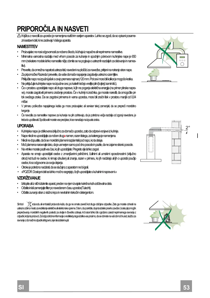 Kuhinjska napa je oblikovana izključno za domačo uporabo, zato da odpravi vonjave iz kuhinje. Nape nikoli ne uporabljajte za noben druga namen, razen tistega, za katerega je namenjena. Nikoli ne dopustite, da bi se morebitni plameni razplamteli pod napo, ko ta deluje. Moč plamena naravnajte tako, da je usmerjen samo pod dno posode in pazite, da ne zajame stranic posode. Na vrtnike morate paziti ves čas, ko jih uporabljate: Pregreto olje lahko zagori. Aparata ne smejo uporabljati osebe z zmanjšanimi psihičnimi, čutilnimi ali umskimi sposobnostmi (vključno otroci) kot tudi ne osebe, ki nimajo izkušenj ali znanja, razen v primeru, ko jih nadzirajo ali jih o uporabi poučijo osebe, ki so odgovorne za svoja dejanja. • Otroke je potrebno nadzirati, da se slučajno z aparatom ne bi igrali. • »POZOR: Dostopni deli se lahko močno segrejejo, če jih uporabljate s kuhalnimi napravami.«