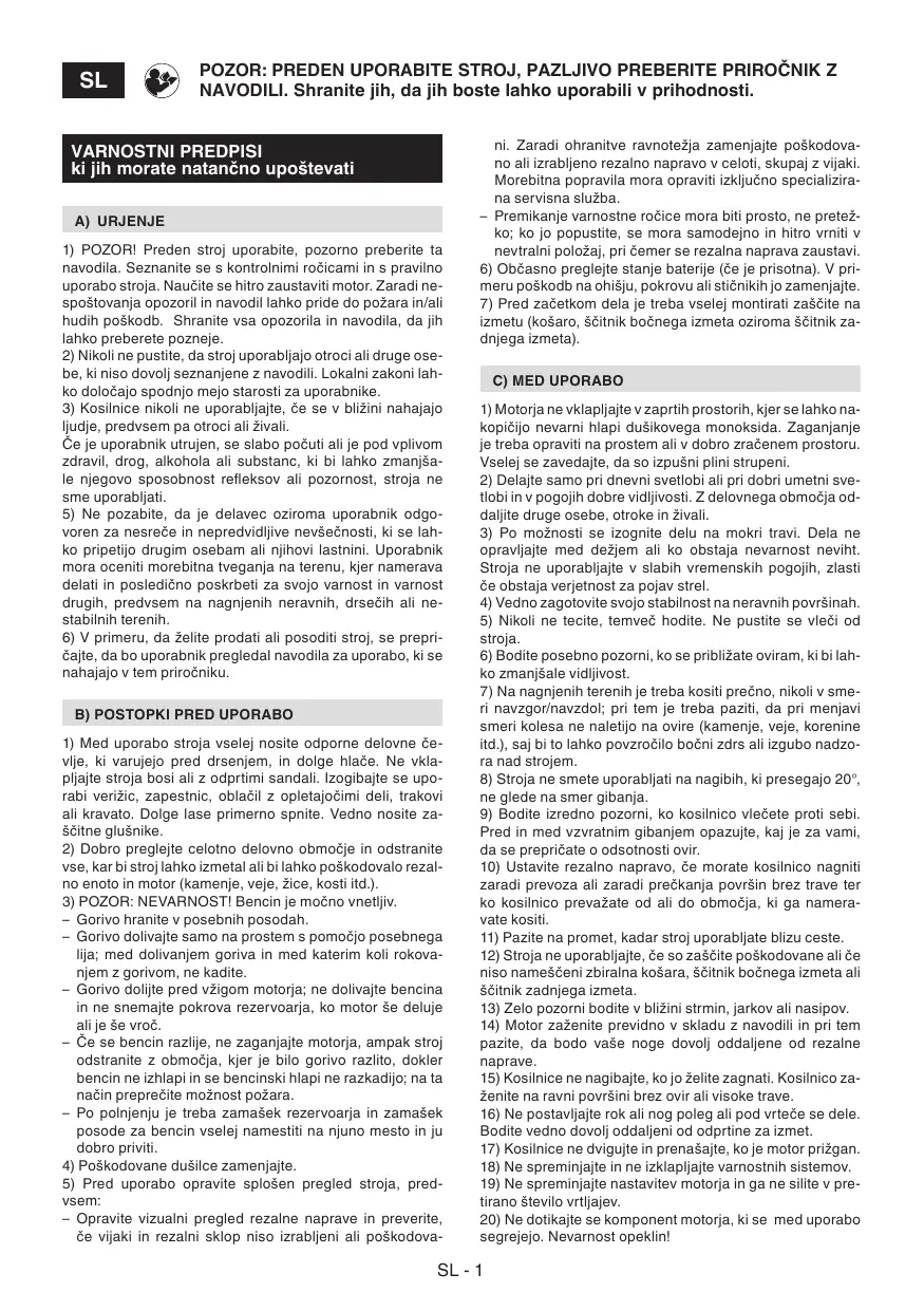 je treba opraviti na prostem ali v dobro zračenem prostoru. Vselej se zavedajte, da so izpušni plini strupeni. 2) Delajte samo pri dnevni svetlobi ali pri dobri umetni svetlobi in v pogojih dobre vidljivosti. Z delovnega območja oddaljite druge osebe, otroke in živali.