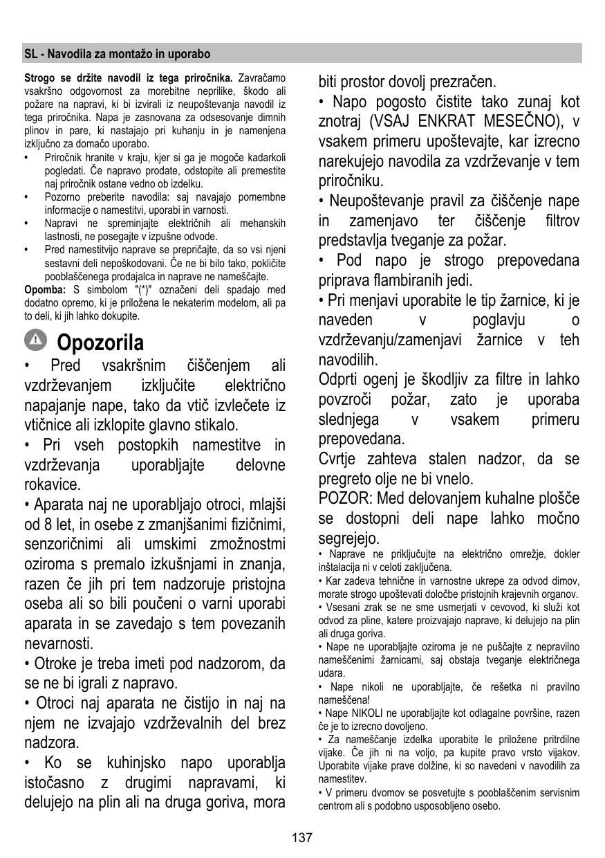 • Para la sustitución de la lámpara sólo utilizar el tipo de lámpara indicado en la sección de mantenimiento/sustitución de este manual. El uso de una llama libre es perjudicial para los filtros y puede provocar incendios, por lo tanto, debe evitarse en cualquier caso. Los fritos debe realizarse con cuidado para evitar que el aceite caliente prenda fuego. ATENCIÓN: Cuando la placa de cocción está funcionando las partes accesibles de la campana pueden calentarse.