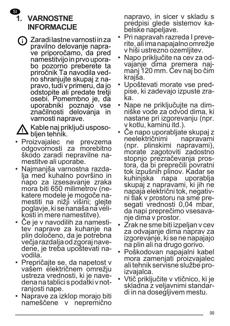 Pour les appareils de Classe I, s’assurer que l’installation électrique de votre intérieur dispose d’une mise à la terre adéquate. Reliez la hotte au conduit de cheminée avec un tube ayant un diamètre minimum de 120 mm. Le parcours des fumées doit être le plus court possible. Respectez toutes les normes concernant l’évacuation de l’air. Ne reliez pas la hotte aspirante aux conduits de cheminée qui acheminent les fumées de combustion (par ex. de chaudières, de cheminées, etc.). Si vous utilisez la hotte en même temps que des appareils non électriques (par ex. appareils à gaz), veillez à ce que la pièce soit adéquatement ventilée, afin d’empêcher le retour du flux des gaz d’évacuation. Si vous utilisez la hotte de cuisine en même temps que des appareils non alimentés à l’électricité, la pression négative dans la 15