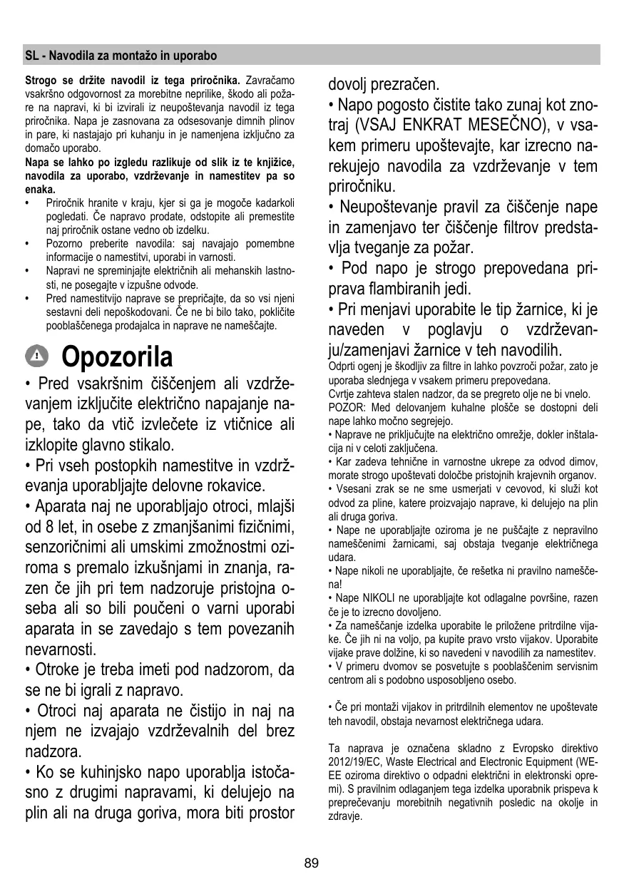 SL - Navodila za montažo in uporabo Strogo se držite navodil iz tega priročnika. Zavračamo vsakršno odgovornost za morebitne neprilike, škodo ali požare na napravi, ki bi izvirali iz neupoštevanja navodil iz tega priročnika. Napa je zasnovana za odsesovanje dimnih plinov in pare, ki nastajajo pri kuhanju in je namenjena izključno za domačo uporabo. Napa se lahko po izgledu razlikuje od slik iz te knjižice, navodila za uporabo, vzdrževanje in namestitev pa so enaka.
