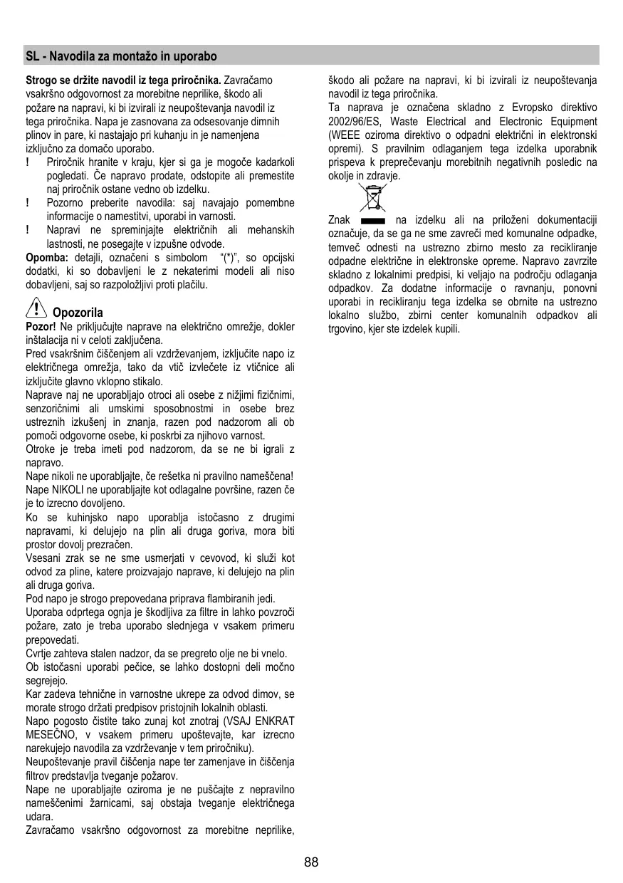 SL - Navodila za montažo in uporabo škodo ali požare na napravi, ki bi izvirali iz neupoštevanja navodil iz tega priročnika. Ta naprava je označena skladno z Evropsko direktivo 2002/96/ES, Waste Electrical and Electronic Equipment (WEEE oziroma direktivo o odpadni električni in elektronski opremi). S pravilnim odlaganjem tega izdelka uporabnik prispeva k preprečevanju morebitnih negativnih posledic na okolje in zdravje. Strogo se držite navodil iz tega priročnika. Zavračamo vsakršno odgovornost za morebitne neprilike, škodo ali požare na napravi, ki bi izvirali iz neupoštevanja navodil iz tega priročnika. Napa je zasnovana za odsesovanje dimnih plinov in pare, ki nastajajo pri kuhanju in je namenjena izključno za domačo uporabo. Priročnik hranite v kraju, kjer si ga je mogoče kadarkoli pogledati. Če napravo prodate, odstopite ali premestite naj priročnik ostane vedno ob izdelku. Pozorno preberite navodila: saj navajajo pomembne informacije o namestitvi, uporabi in varnosti. Napravi ne spreminjajte električnih ali mehanskih lastnosti, ne posegajte v izpušne odvode. Opomba: detajli, označeni s simbolom “(*)”, so opcijski dodatki, ki so dobavljeni le z nekaterimi modeli ali niso dobavljeni, saj so razpoložljivi proti plačilu. Znak na izdelku ali na priloženi dokumentaciji označuje, da se ga ne sme zavreči med komunalne odpadke, temveč odnesti na ustrezno zbirno mesto za recikliranje odpadne električne in elektronske opreme. Napravo zavrzite skladno z lokalnimi predpisi, ki veljajo na področju odlaganja odpadkov. Za dodatne informacije o ravnanju, ponovni uporabi in recikliranju tega izdelka se obrnite na ustrezno lokalno službo, zbirni center komunalnih odpadkov ali trgovino, kjer ste izdelek kupili. Opozorila Pozor! Ne priključujte naprave na električno omrežje, dokler inštalacija ni v celoti zaključena. Pred vsakršnim čiščenjem ali vzdrževanjem, izključite napo iz električnega omrežja, tako da vtič izvlečete iz vtičnice ali izključite glavno vklopno stikalo. Naprave naj ne uporabljajo otroci ali osebe z nižjimi fizičnimi, senzoričnimi ali umskimi sposobnostmi in osebe brez ustreznih izkušenj in znanja, razen pod nadzorom ali ob pomoči odgovorne osebe, ki poskrbi za njihovo varnost. Otroke je treba imeti pod nadzorom, da se ne bi igrali z napravo. Nape nikoli ne uporabljajte, če rešetka ni pravilno nameščena! Nape NIKOLI ne uporabljajte kot odlagalne površine, razen če je to izrecno dovoljeno. Ko se kuhinjsko napo uporablja istočasno z drugimi napravami, ki delujejo na plin ali druga goriva, mora biti prostor dovolj prezračen. Vsesani zrak se ne sme usmerjati v cevovod, ki služi kot odvod za pline, katere proizvajajo naprave, ki delujejo na plin ali druga goriva. Pod napo je strogo prepovedana priprava flambiranih jedi. Uporaba odprtega ognja je škodljiva za filtre in lahko povzroči požare, zato je treba uporabo slednjega v vsakem primeru prepovedati. Cvrtje zahteva stalen nadzor, da se pregreto olje ne bi vnelo. Ob istočasni uporabi pečice, se lahko dostopni deli močno segrejejo. Kar zadeva tehnične in varnostne ukrepe za odvod dimov, se morate strogo držati predpisov pristojnih lokalnih oblasti. Napo pogosto čistite tako zunaj kot znotraj (VSAJ ENKRAT MESEČNO, v vsakem primeru upoštevajte, kar izrecno narekujejo navodila za vzdrževanje v tem priročniku). Neupoštevanje pravil čiščenja nape ter zamenjave in čiščenja filtrov predstavlja tveganje požarov. Nape ne uporabljajte oziroma je ne puščajte z nepravilno nameščenimi žarnicami, saj obstaja tveganje električnega udara. Zavračamo vsakršno odgovornost za morebitne neprilike,