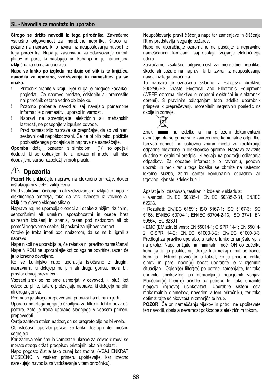 - EMC (EM združljivost): EN 55014-1; CISPR 14-1; EN 55014-2; CISPR 14-2; EN/IEC 61000-3-2; EN/IEC 61000-3-3. Predlogi za pravilno uporabo, s katero lahko zmanjsate vliv na okolje: Napo prižgite na minimalni moči ON ob začetku kuhanja, in jo pustite, njel deluje tudi nekaj minut po koncu kuhanja. Hitrost povečajte le takrat, ko je prisotno veliko dimov in pare, način(e) boost uporabite le izjemnih situacijah. Ogleni(e) filter(re) po potrebi zamenjale, ter tako ohranite učinkovitost pri odpravljanju neprijjetnih vonjav. Maščobni(e) filter(re) očistite po potrebi, ter tako ohranite njegovo (njihovo) učinkovitost. Uporabite system cevi maksimalnih diametrov, naveden v tem priročniku, ter tako optimizirajte učinkovitost in zmanjsaje hrup.