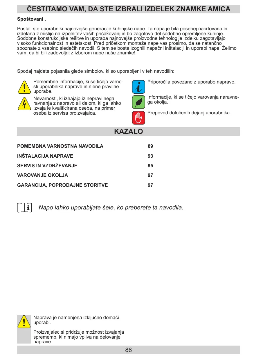 Postali ste uporabniki majnovejse generacione kuhinjske nape. Ta napa je bila posebej načrtovana in izdelana z mislijo na izpolnitev vaših pričakovanj in bo zagotovo del sodobno opremljene kuhinje. Sodobne konstrukcijski rešitve in uporaba majnovejse proizvodne technologije izdelku zagotavljajo visoko funkionalnost in estetskost. Pred pričekom montaže nape vas prosimo, da se natančno spoznate z vsebino sledečih navodil. S tem se boste izognili napacni instalaciji in uporabi nape. Želimo vam, da bi bili zadovolji n zaiborom nape naše znamke!
