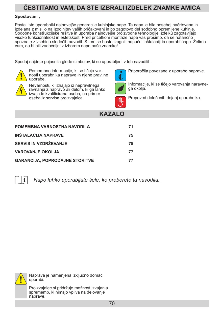 ČESTITAMO VAM, DA STE IZBRALI IZDELEK ZNAMKE AMICA Spoštovani , Postali ste uporabniki najnovejše generacije kuhinjske nape. Ta napa je bila posebej načrtovana in izdelana z mislijo na izpolnitev vaših pričakovanj in bo zagotovo del sodobno opremljene kuhinje. Sodobne konstrukcijske rešitve in uporaba najnovejše proizvodne tehnologije izdelku zagotavljajo visoko funkcionalnost in estetskost. Pred pričetkom montaže nape vas prosimo, da se natančno spoznate z vsebino sledečih navodil. S tem se boste izognili napačni inštalaciji in uporabi nape. Želimo vam, da bi bili zadovoljni z izborom nape naše znamke! Spodaj najdete pojasnila glede simbolov, ki so uporabljeni v teh navodilih: Pomembne informacije, ki se tičejo varnosti uporabnika naprave in njene pravilne uporabe. Nevarnosti, ki izhajajo iz nepravilnega ravnanja z napravo ali delom, ki ga lahko izvaja le kvalificirana oseba, na primer oseba iz servisa proizvajalca.