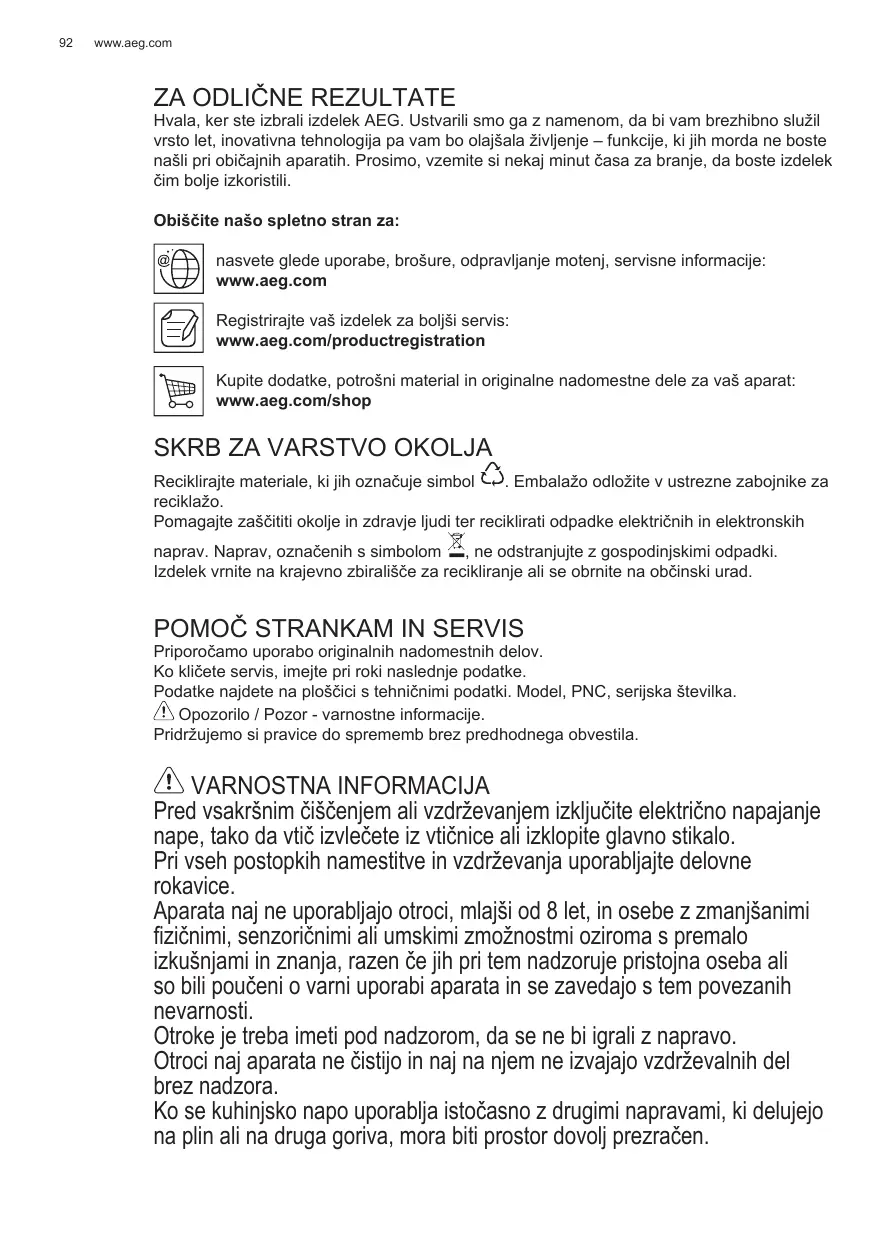 Hvala, ker ste izbrali izdelek AEG. Ustvarili smo ga z namenom, da bi vam brezhibno služil vrsto let, inovativna tehnologija pa vam bo olajšalaŽivljenje - funkcjije, ki jih morda ne boste našli pri obićajnih aparath. Prosimo, vzemite si nekaj minut Časa za branje, da boste izdelek Čim bolje izkoristili.