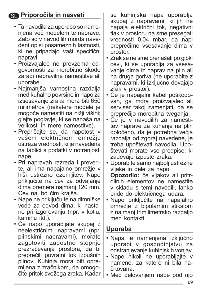 • La distance de sécurité minimum entre le plan de cuisson et la hotte aspirante est de 650 mm (certains modèles peuvent être installés à une hauteur inférieure; voir le paragraphe concernant les dimensions de travail et l’installation). • Assurez-vous que la tension de votre secteur correspond à celle indiquée sur la plaque des données appliquée à l’intérieur de la hotte. • Pour les appareils de Classe I, s’assurer que l’installation électrique de votre intérieur dispose d’une mise à la terre adéquate. Relier l’aspirateur au conduit de cheminée avec un tube d’un diamètre minimum de 120 mm. Le parcours des fumées doit être le plus court possible. • Ne pas relier la hotte aspirante aux conduits de cheminée qui acheminent les fumées de combustion (par exemple de chaudières, de cheminées, etc.).