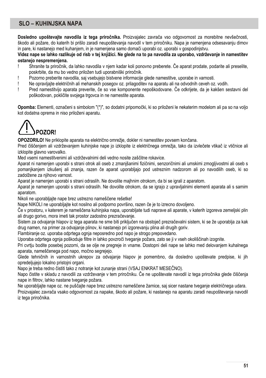El uso de la llama abierta puede dañar los filtros y causar un incendio, por lo que debe evitarse bajo cualquier circunstancia. Al freír tenga cuidado de que el aceite no se sobrecaliente y se encienda. Las partes accesibles de la campana pueden calentarse durante el funcionamiento del aparato de cocina ubicado debajo de la campana. En cuanto a las medidas técnicas y de seguridad para la evaporación de vapores, es importante seguir estrictamente las reglas determinadas por las autoridades locales. La campana extractora debe limpiarse regularmente tanto desde el interior como desde el exterior (POR LO MENOS UNA VEZ AL MES). Limpie la campana extractora de acuerdo con las instrucciones de mantenimiento de este manual. Si no sigue las instrucciones en este manual con respecto a la limpieza de la campana extractora y de los filtros, puede haber riesgo de incendio. No utilice la campana extractora o no deje la campana extractora sin la bombilla correctamente instalada, de lo contrario, podría producirse una descarga eléctrica. El fabricante se exime de cualquier responsabilidad por defectos, daños o incendios que puedan surgir en el dispositivo debido al incumplimiento de las instrucciones de este manual.