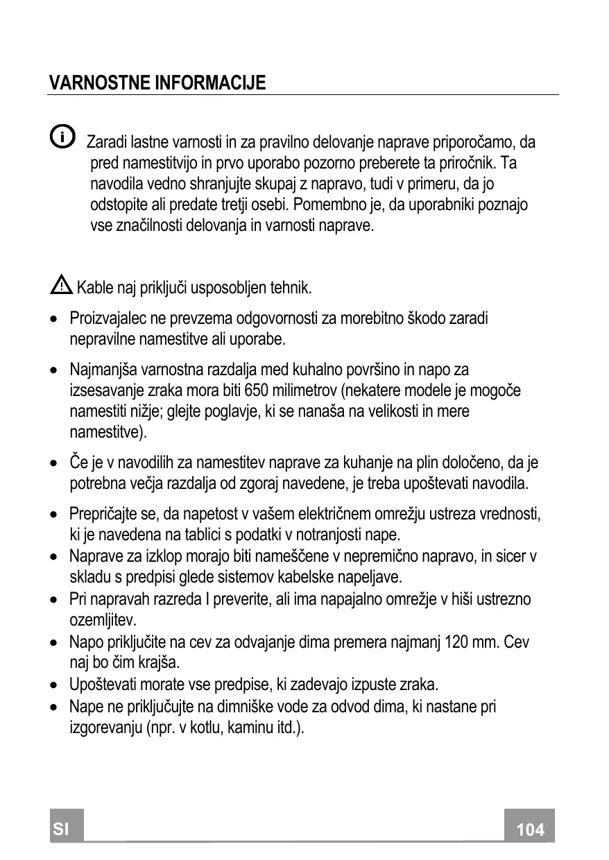 VARNOSTNE INFORMACIJE Zaradi lastne varnosti in za pravilno delovanje naprave priporočamo, da pred namestitvijo in prvo uporabo pozorno preberete ta priročnik. Ta navodila vedno shranjujte skupaj z napravo, tudi v primeru, da jo odstopite ali predate tretji osebi. Pomembno je, da uporabniki poznajo vse značilnosti delovanja in varnosti naprave. Kable naj priključi usposobljen tehnik. Proizvajalec ne prevzema odgovornosti za morebitno škodo zaradi nepravilne namestitve ali uporabe. Najmanjša varnostna razdalja med kuhalno površino in napo za izsesavanje zraka mora biti 650 milimetrov (nekatere modele je mogoče namestiti nižje; glejte poglavje, ki se nanaša na velikosti in mere namestitve). Če je v navodilih za namestitev naprave za kuhanje na plin določeno, da je potrebna večja razdalja od zgoraj navedene, je treba upoštevati navodila. Prepričajte se, da napetost v vašem električnem omrežju ustreza vrednosti, ki je navedena na tablici s podatki v notranjosti nape. Naprave za izklop morajo biti nameščene v nepremično napravo, in sicer v skladu s predpisi glede sistemov kabelske napeljave. Pri napravah razreda I preverite, ali ima napajalno omrežje v hiši ustrezno ozemljitev. Napo priključite na cev za odvajanje dima premera najmanj 120 mm. Cev naj bo čim krajša. Upoštevati morate vse predpise, ki zadevajo izpuste zraka. Nape ne priključujte na dimniške vode za odvod dima, ki nastane pri izgorevanju (npr. v kotlu, kaminu itd.).