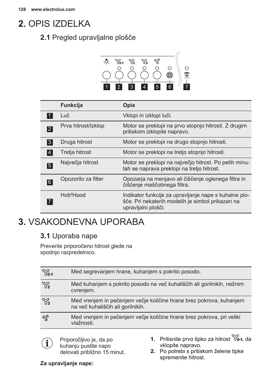 Preverite priporočeno hitrost glede na spodnjo razpredelnico. Med segrevanjem hrane, kuhanjem s pokrito posodo. Med kuhanjem s pokrito posodo na več kuhališčih ali gorilnikih, nežnim cvrenjem. Med vrenjem in pečenjem večje količine hrane brez pokrova, kuhanjem na več kuhališčih ali gorilnikih. Med vrenjem in pečenjem večje količine hrane brez pokrova, pri veliki vlažnosti. Priporočljivo je, da po kuhanju pustite napo delovati približno 15 minut. Za upravljanje nape: , da
