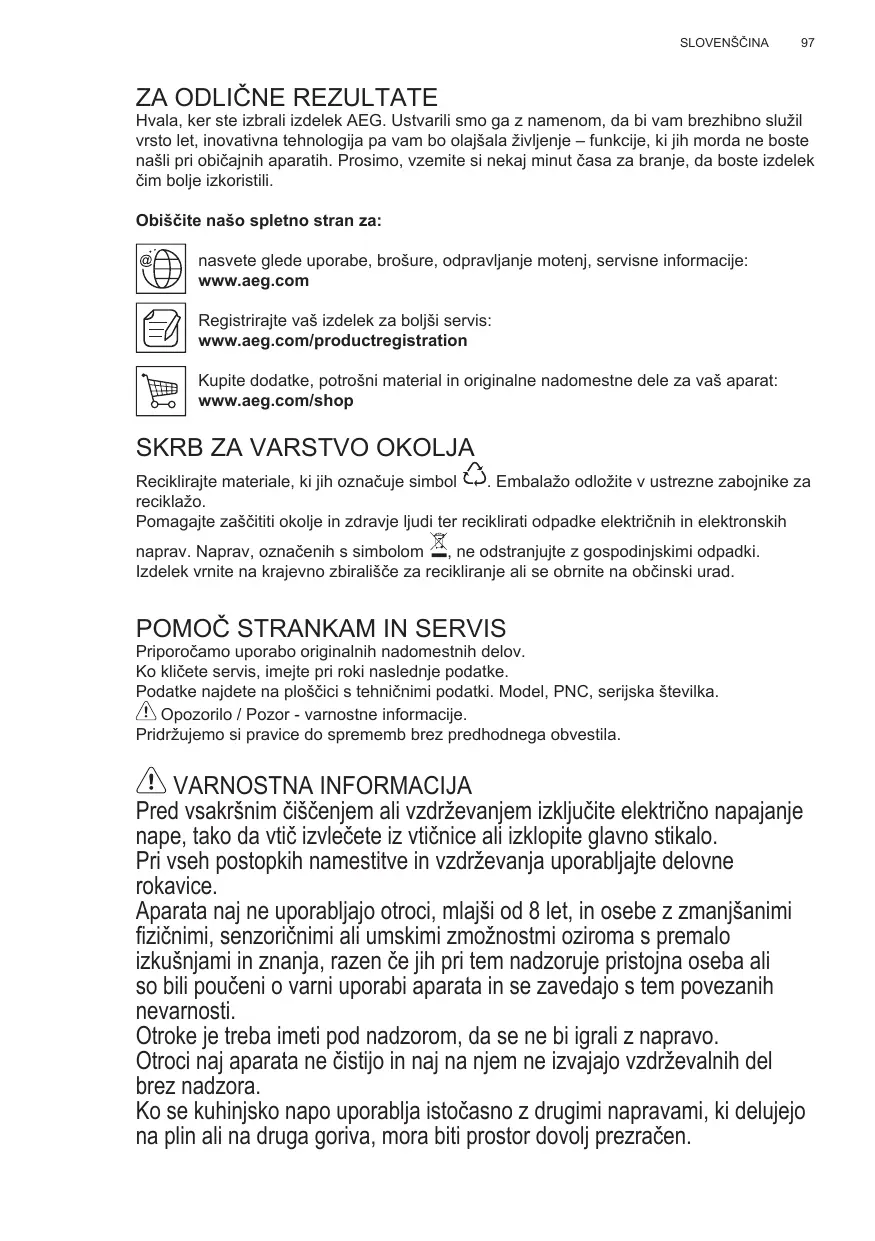www.aeg.com Napo pogosto čistite tako zunaj kot znotraj (VSAJ ENKRAT MESEČNO, v vsakem primeru upoštevajte, kar izrecno narekujejo navodila za vzdrževanje v tem priročniku). Neupoštevanje pravil za čiščenje nape in zamenjavo ter čiščenje filtrov predstavlja tveganje požarov. Pod napo je strogo prepovedana priprava flambiranih jedi. Odprti ogenj je škodljiv za filtre in lahko povzroči požar, zato je uporaba slednjega v vsakem primeru prepovedana. Cvrtje zahteva stalen nadzor, da se pregreto olje ne bi vnelo. POZOR: Med delovanjem kuhalne plošče se dostopni deli nape lahko močno segrejejo.Za priključitev nape v električno omrežje so dovoljeni samo certificirani električni adapterji, ne pa razdelilniki z več vtičnicami