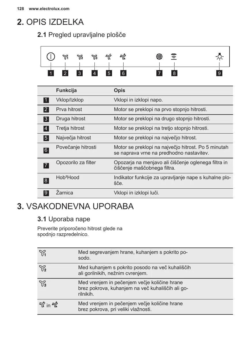 3. VSAKODNEVNA UPORABA 3.1 Uporaba nape Preverite priporočeno hitrost glede na spodnjo razpredelnico. Med segrevanjem hrane, kuhanjem s pokrito po‐ sodo. Med kuhanjem s pokrito posodo na več kuhališčih ali gorilnikih, nežnim cvrenjem. Med vrenjem in pečenjem večje količine hrane brez pokrova, kuhanjem na več kuhališčih ali go‐ rilnikih. in