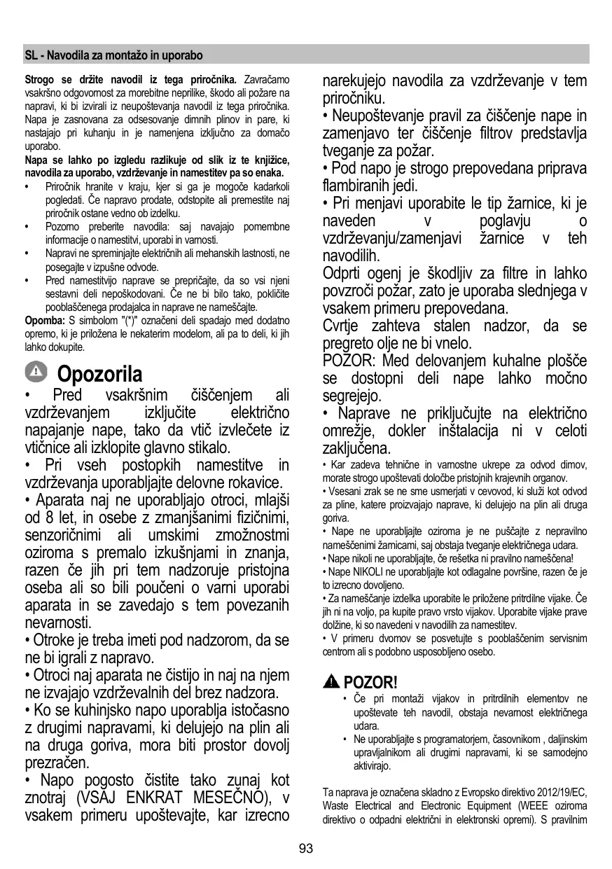 narekujejo navodila za vzdrževanje v tem priročniku. • Neupoštevanje pravil za čiščenje nape in zamenjavo ter čiščenje filtrov predstavlja tveganje za požar. • Pod napo je strogo prepovedana priprava flambiranih jedi. • Pri menjavi uporabite le tip žarnice, ki je naveden v poglavju o vzdrževanju/zamenjavi žarnice v teh navodilih. Odprti ogenj je škodljiv za filtre in lahko povzroči požar, zato je uporaba slednjega v vsakem primeru prepovedana. Cvrtje zahteva stalen nadzor, da se pregreto olje ne bi vnelo. POZOR: Med delovanjem kuhalne plošče se dostopni deli nape lahko močno segrejejo. • Naprave ne priključujte na električno omrežje, dokler inštalacija ni v celoti zaključena.