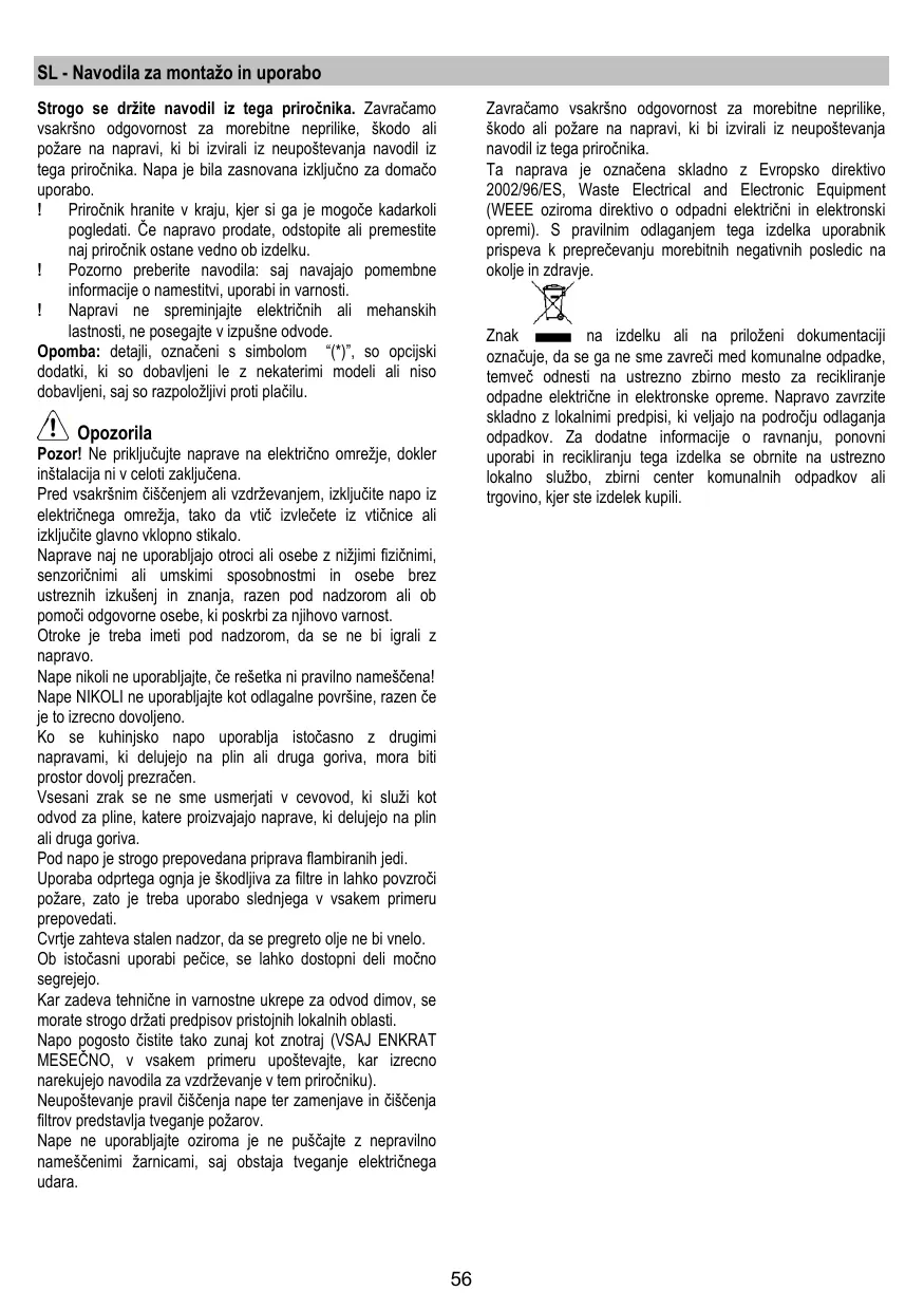 La non observation de ces normes de nettoyage de la hotte et du changement et nettoyage des filtres comporte des risques d’incendie. Ne pas utiliser ou laisser la hotte sans que les ampoules soient correctement placées pour éviter tout risque de choc électrique. La société décline toute responsabilité pour d’éventuels inconvénients, dégâts ou incendies provoqués par l’appareil et dérivés de la non observation des instructions reprises dans ce manuel. Cet appareil porte le symbole du recyclage conformément à la Directive Européenne 2002/96/CE concernant les Déchets d’Équipements Électriques et Électroniques (DEEE ou WEEE). En procédant correctement à la mise au rebut de cet appareil, vous contribuerez à empêcher toute conséquence nuisible pour l’environnement et la santé de l’homme.