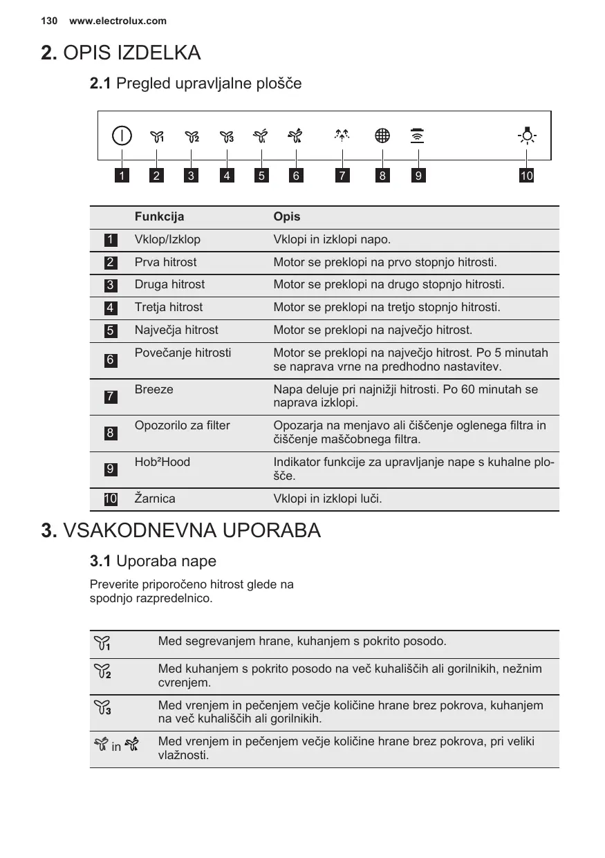 Het wordt aanbevolen om de kap ongeveer 15 minuten na het koken aan te laten staan. Het bedieningspaneel is een sensorveld. Raak de symbolen gedurende 1 seconde aan om de functies in te schakelen. Om de kap: 1. Zet het apparaat aan door op het te drukken. symbool Je kunt nu de functies activeren. 2. Raak om de functie in te schakelen het symbool aan. De verlichting van de afzuigkappen werkt onafhankelijk van andere afzuigkapfuncties. Om het kookoppervlak te verlichten, raak je het lampje aan . Om de lichtintensiteit te wijzigen, houd je het symbool opnieuw ingedrukt. Om het apparaat uit te schakelen druk je opnieuw op het symbool 1. Trek aan de hendel van de filter onder de kap (1) en kantel de