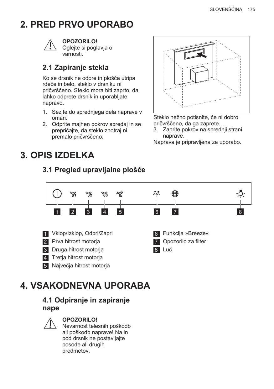 1. VARNOSTNE INFORMACIJE IN NAMESTITEV OPOZORILO! Za varnostne informacije in namestitev si oglejte dodatna navodila za namestitev. Pred uporabo ali vzdrževalnimi deli na napravi pozorno preberite poglavja o varnosti.