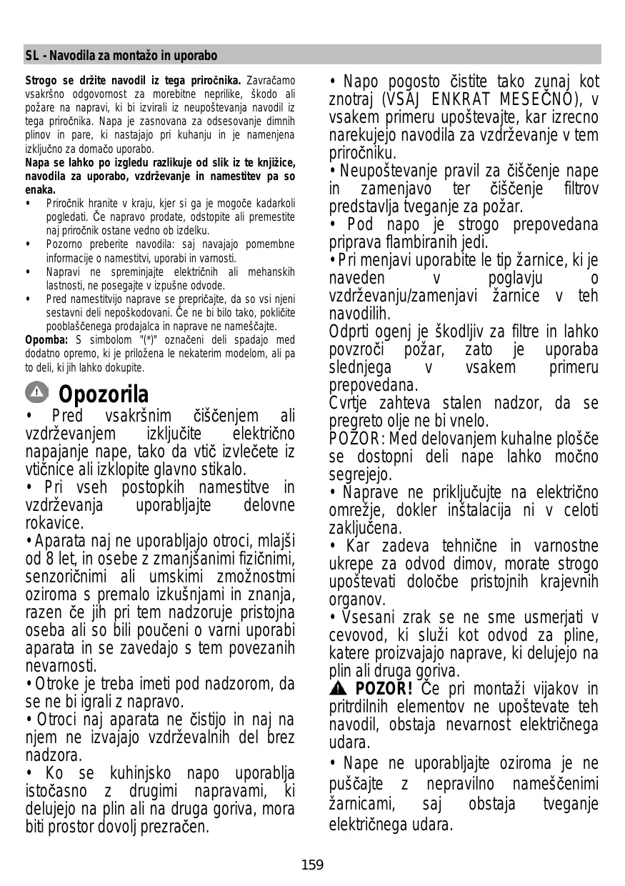 • Pred vsakršnim čiščenjem ali vzdrževanjem izključite električno napajanje nape, tako da vtič izvlečete iz vtičnice ali izklopite glavno stikalo. • Pri vseh postopkih namestitve in vzdrževanja uporabljajte delovne rokavice. • Aparata naj ne uporabljajo otroci, mlajši od 8 let, in osebe z zmanjšanimi fizičnimi, senzoričnimi ali umskimi zmožnostmi oziroma s premalo izkušnjami in znanja, razen če jih pri tem nadzoruje pristojna oseba ali so bili poučeni o varni uporabi aparata in se zavedajo s tem povezanih nevarnosti. • Otroke je treba imeti pod nadzorom, da se ne bi igrali z napravo. • Otroci naj aparata ne čistijo in naj na njem ne izvajajo vzdrževalnih del brez nadzora. • Ko se kuhinjsko napo uporablja istočasno z drugimi napravami, ki delujejo na plin ali na druga goriva, mora biti prostor dovolj prezračen. 159