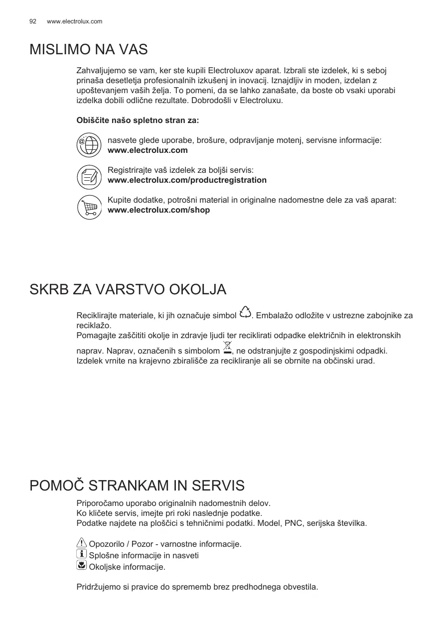 Zahvaljujemo se vam, ker ste kupili Electroluxov aparat. Izbrali ste izdelek, ki s seboj prinaša desetletja profesionalnih izkušenj in inovacij. Iznajdljiv in moden, izdelan z upoštevanjem vaših želja. To pomeni, da se lahko zanašate, da boste ob vsaki uporabi izdelka dobili odlične rezultate. Dobrodošli v Electroluxu. Obiščite našo spletno stran za: nasvete glede uporabe, brošure, odpravljanje motenj, servisne informacije: www.electrolux.com Registrirajte vaš izdelek za boljši servis: www.electrolux.com/productregistration Kupite dodatke, potrošni material in originalne nadomestne dele za vaš aparat: www.electrolux.com/shop
