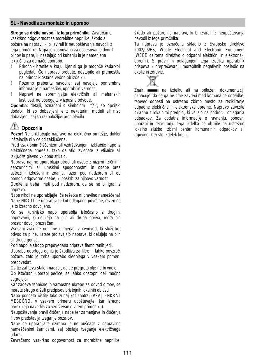 Strogo se držite navodil iz tega priročnika. Zavračamo vsakršno odgovornost za morebitne neprilike, škodo ali požare na napravi, ki bi izvirali iz neupoštevanja navodil iz tega priročnika. Napa je zasnovana za odsesovanje dimnih plinov in pare, ki nastajajo pri kuhanju in je namenjena izključno za domačo uporabo. ! Priročnik hranite v kraju, kjer si ga je mogoče kadarkoli pogledati. Če napravo prodate, odstopite ali premestite naj priročnik ostane vedno ob izdelku. ! Pozorno preberite navodila: saj navajajo pomembne informacije o namestitvi, uporabi in varnosti. ! Napravi ne spreminjajte električnih ali mehanskih lastnosti, ne posegajte v izpušne odvode. Opomba: detajli, označeni s simbolom “(*)”, so opcijski dodatki, ki so dobavljeni le z nekaterimi modeli ali niso dobavljeni, saj so razpoložljivi proti plačilu.