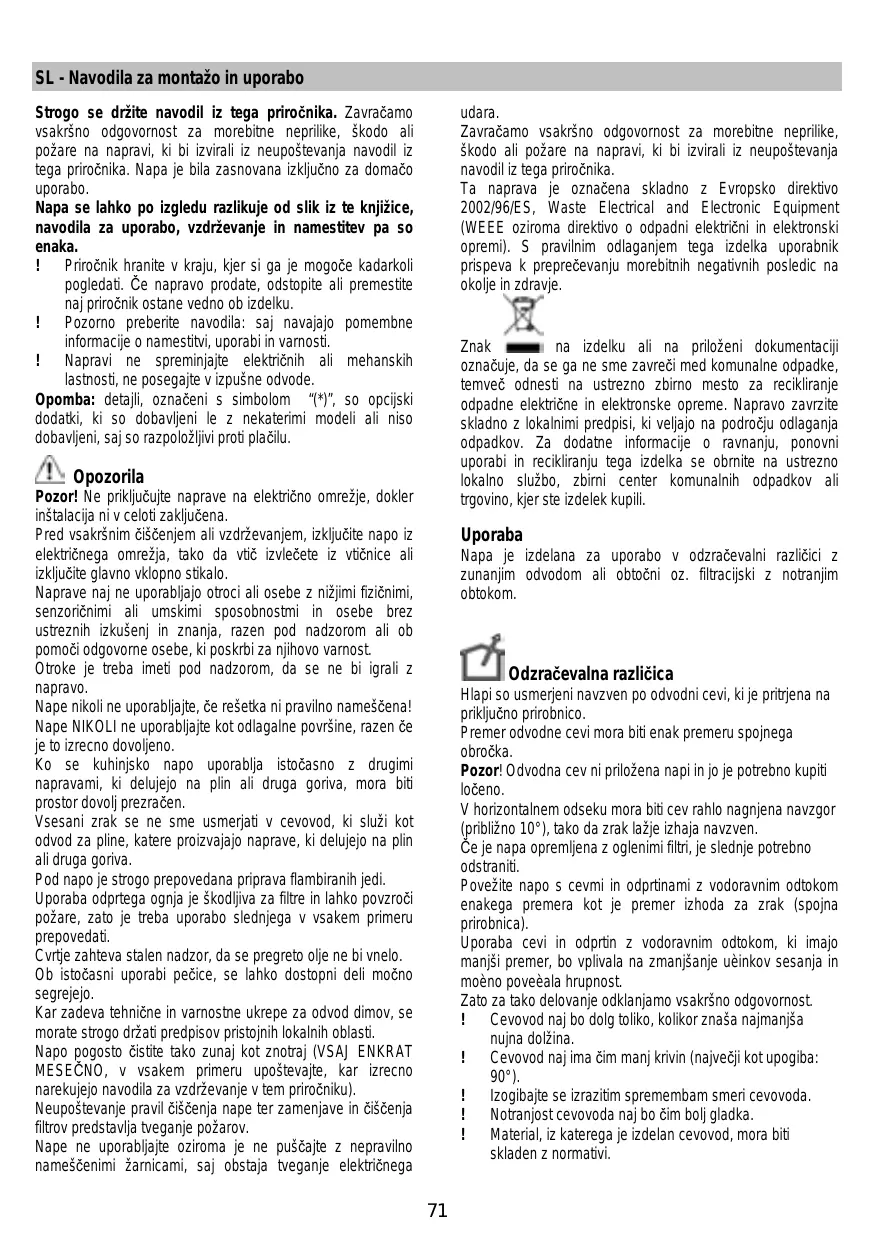Montaje y modo de empleo Instruções para montagem e utilização ΟΔΗΓΙΕΣ ΣΥΝΑΡΜΟΛΟΓΗΣΗΣ ΚΑΙ ΧΡΗΣΗΣ En ce qui concerne les mesures techniques et de sécurité à adopter pour l’évacuation des fumées, s’en tenir strictement à ce qui est prévu dans les règlements des autorités locales compétentes. La hotte doit être régulièrement nettoyée, aussi bien à l’intérieur qu’à l’extérieur (AU MOINS UNE FOIS PAR MOIS, respecter néanmoins les instructions relatives à l’entretien fournies dans ce manuel). La non observation de ces normes de nettoyage de la hotte et du changement et nettoyage des filtres comporte des risques d’incendie. Ne pas utiliser ou laisser la hotte sans que les ampoules soient correctement placées pour éviter tout risque de choc électrique. La société décline toute responsabilité pour d’éventuels inconvénients, dégâts ou incendies provoqués par l’appareil et dérivés de la non observation des instructions reprises dans ce manuel. Cet appareil porte le symbole du recyclage conformément à la Directive Européenne 2002/96/CE concernant les Déchets d’Équipements Électriques et Électroniques (DEEE ou WEEE). En procédant correctement à la mise au rebut de cet appareil, vous contribuerez à empêcher toute conséquence nuisible pour l’environnement et la santé de l’homme.