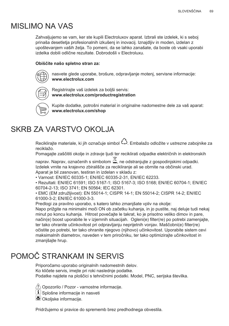 Zahvaljujemo se vam, ker ste kupili Electroluxov aparat. Izbrali ste izdelek, ki s seboj prinaša desetletja profesionalnih izkušenj in inovacij. Iznajdljiv in moden, izdelan z upoštevanjem vaših želja. To pomeni, da se lahko zanašate, da boste ob vsaki uporabi izdelka dobili odlične rezultate. Dobrodošli v Electroluxu. Obiščite našo spletno stran za: nasvete glede uporabe, brošure, odpravljanje motenj, servisne informacije: www.electrolux.com Registrirajte vaš izdelek za boljši servis: www.electrolux.com/productregistration Kupite dodatke, potrošni material in originalne nadomestne dele za vaš aparat: www.electrolux.com/shop