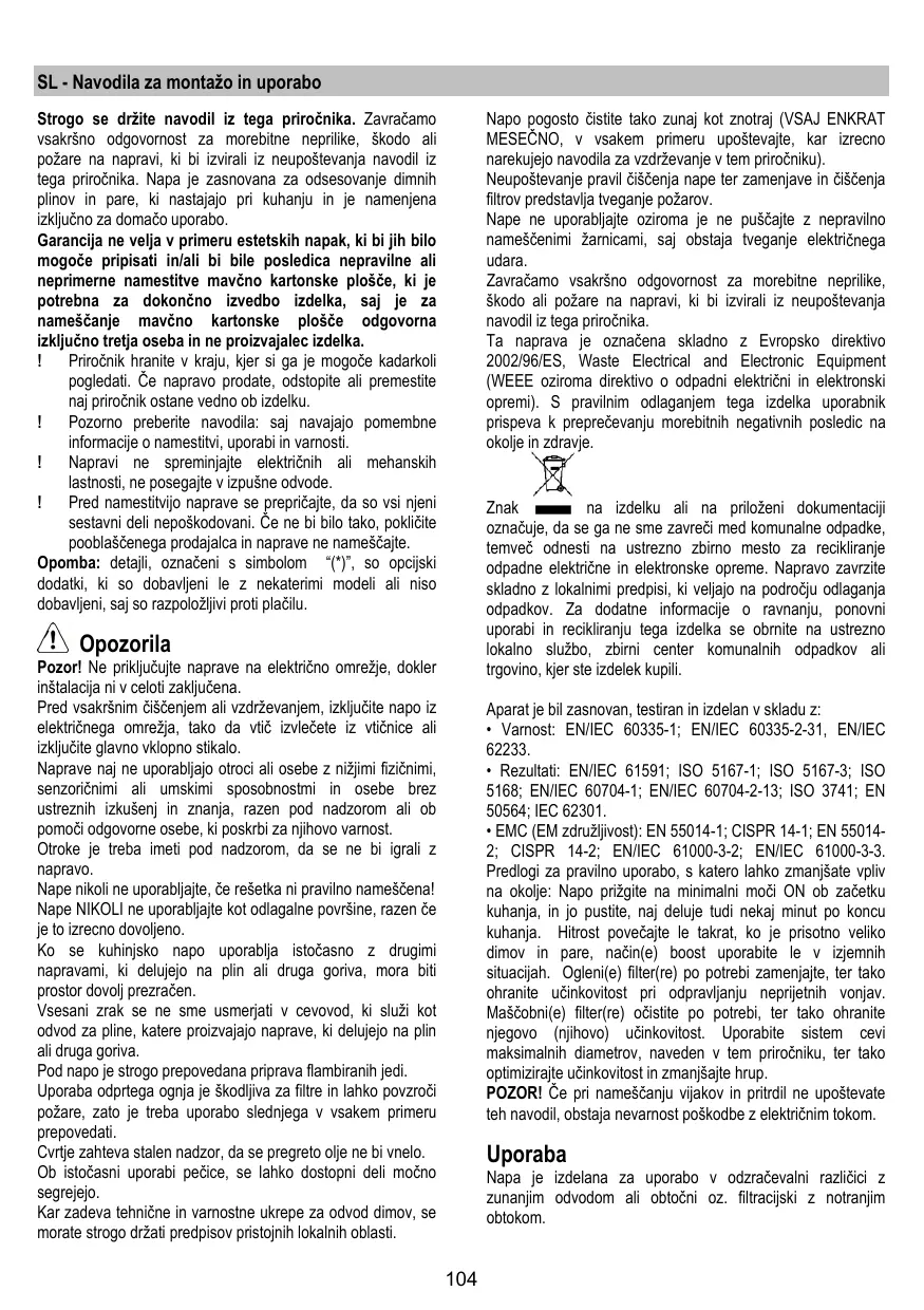 Montaje y modo de empleo Instruções para montagem e utilização Ο∆ΗΓΙΕΣ ΣΥΝΑΡΜΟΛΟΓΗΣΗΣ ΚΑΙ ΧΡΗΣΗΣ Monterings- och bruksanvisningar L’utilisation de flammes libres peut entraîner des dégâts aux filtres et peut donner lieu à des incendies, il faut donc les éviter à tout prix. La friture d’aliments doit être réalisée sous contrôle pour éviter que l’huile surchauffée ne prenne feu. Les pièces accessibles peuvent se réchauffer de façon importante quand elles sont utilisées avec des appareils pour la cuisson. En ce qui concerne les mesures techniques et de sécurité à adopter pour l’évacuation des fumées, s’en tenir strictement à ce qui est prévu dans les règlements des autorités locales compétentes. La hotte doit être régulièrement nettoyée, aussi bien à l’intérieur qu’à l’extérieur (AU MOINS UNE FOIS PAR MOIS, respecter néanmoins les instructions relatives à l’entretien fournies dans ce manuel). La non observation de ces normes de nettoyage de la hotte et du changement et nettoyage des filtres comporte des risques d’incendie. Ne pas utiliser ou laisser la hotte sans que les ampoules soient correctement placées pour éviter tout risque de choc électrique. La société décline toute responsabilité pour d’éventuels inconvénients, dégâts ou incendies provoqués par l’appareil et dérivés de la non observation des instructions reprises dans ce manuel. Cet appareil porte le symbole du recyclage conformément à la Directive Européenne 2002/96/CE concernant les Déchets d’Équipements Électriques et Électroniques (DEEE ou WEEE). En procédant correctement à la mise au rebut de cet appareil, vous contribuerez à empêcher toute conséquence nuisible pour l’environnement et la santé de l’homme.