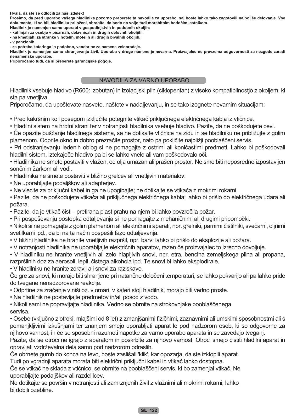 SL 121 Hvala, da ste se odločili za naš izdelek! Prosimo, da pred uporabo vašega hladilnika pozorno preberete ta navodila za uporabo, saj boste lahko tako zagotovili najboljše delovanje. Vse dokumente, ki so bili hladilniku priloženi, shranite, da bodo na voljo tudi morebitnim bodočim lastnikom. Hladilnik je namenjen samo uporabi v gospodinjstvih in podobnih okoljih: - kuhinjah za osebje v pisarnah, delavnicah in drugih delovnih okoljih, - na kmetijah, za stranke v hotelih, motelih ali drugih bivalnih okoljih, - v penzionih, - za potrebe kateringa in podobno, vendar ne za namene veleprodaje. Hladilnik je namenjen samo shranjevanju živil. Uporaba v druge namene je nevarna. Proizvajalec ne prevzema odgovornosti za nezgode zaradi nenamenske uporabe. Priporočamo tudi, da si preberete garancijske pogoje.