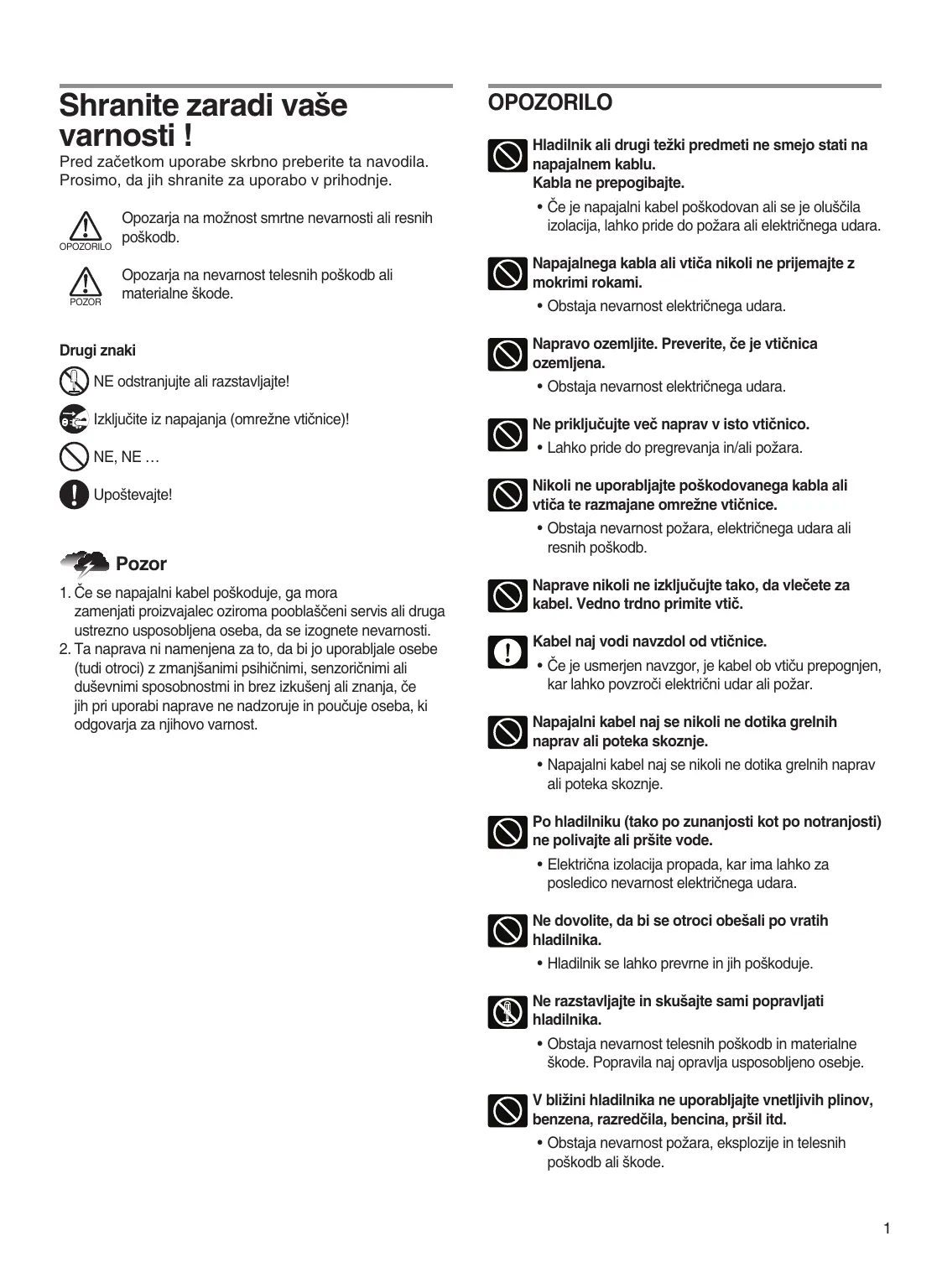 OPOZORILO Hladilnik ali drugi težki predmeti ne smejo stati na napajalnem kablu. Kabla ne prepogibajte. • Če je napajalni kabel poškodovan ali se je oluščila izolacija, lahko pride do požara ali električnega udara. Napajalnega kabla ali vtiča nikoli ne prijemajte z mokrimi rokami. • Obstaja nevarnost električnega udara. Napravo ozemljite. Preverite, če je vtičnica ozemljena. • Obstaja nevarnost električnega udara. Ne priključujte več naprav v isto vtičnico. • Lahko pride do pregrevanja in/ali požara. Nikoli ne uporabljajte poškodovanega kabla ali vtiča te razmajane omrežne vtičnice. • Obstaja nevarnost požara, električnega udara ali resnih poškodb.
