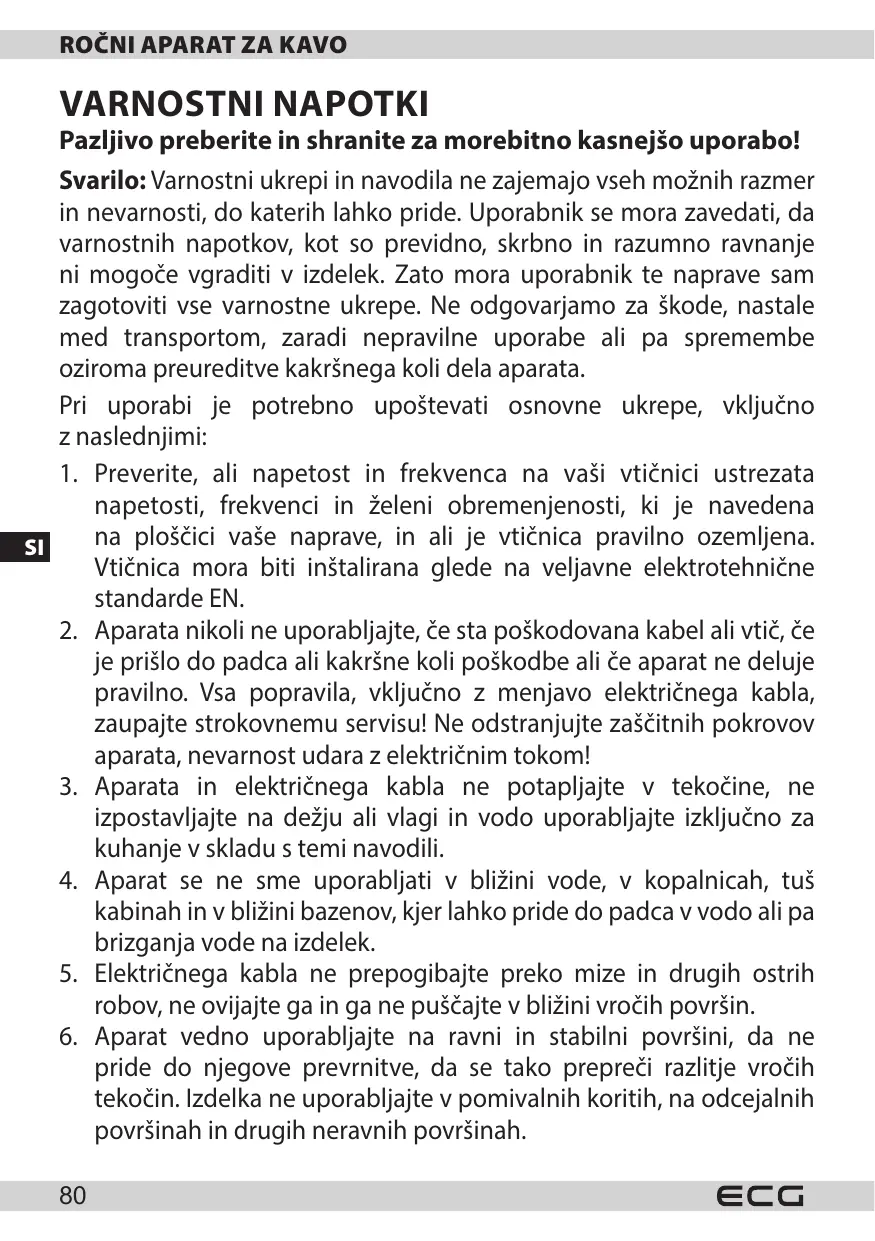 - ECG ne odgovarja za škode ali poškodbe, do katerih je prišlo zaradi nepazljivosti ali nepravilne uporabe. Pred uporabo ne pozabite temeljito prebrati vseh napotkov in informacij. Zunanja povrsina tega aparata se segreje in lahko povzroci opekline. Ne pušćajte brez nadzora v blizini其中之一.