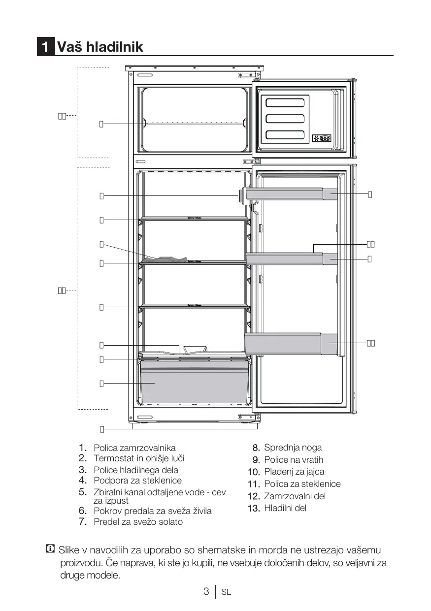 Sprednja noga Police na vratih Pladenj za jajca Polica za steklenice Zamrzovalni del Hladilni del C Slike v navodilih za uporabo so shematske in morda ne ustrezajo vašemu proizvodu. Če naprava, ki ste jo kupili, ne vsebuje določenih delov, so veljavni za druge modele.