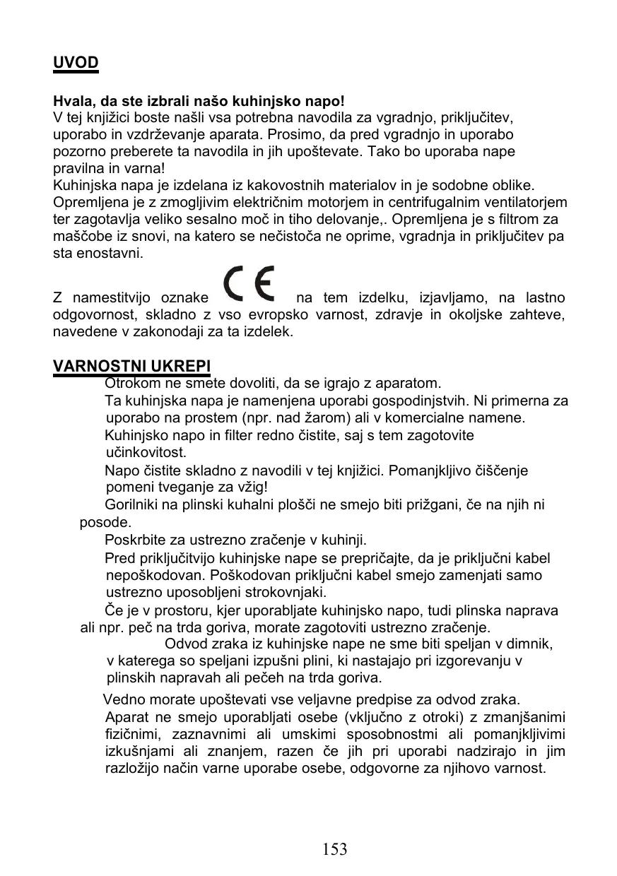 UVOD Hvala, da ste izbrali našo kuhinjsko napo! V tej knjižici boste našli vsa potrebna navodila za vgradnjo, priključitev, uporabo in vzdrževanje aparata. Prosimo, da pred vgradnjo in uporabo pozorno preberete ta navodila in jih upoštevate. Tako bo uporaba nape pravilna in varna! Kuhinjska napa je izdelana iz kakovostnih materialov in je sodobne oblike. Opremljena je z zmogljivim električnim motorjem in centrifugalnim ventilatorjem ter zagotavlja veliko sesalno moč in tiho delovanje,. Opremljena je s filtrom za maščobe iz snovi, na katero se nečistoča ne oprime, vgradnja in priključitev pa sta enostavni. na tem izdelku, izjavljamo, na lastno Z namestitvijo oznake odgovornost, skladno z vso evropsko varnost, zdravje in okoljske zahteve, navedene v zakonodaji za ta izdelek. VARNOSTNI UKREPI Otrokom ne smete dovoliti, da se igrajo z aparatom. Ta kuhinjska napa je namenjena uporabi gospodinjstvih. Ni primerna za uporabo na prostem (npr. nad žarom) ali v komercialne namene. Kuhinjsko napo in filter redno čistite, saj s tem zagotovite učinkovitost. Napo čistite skladno z navodili v tej knjižici. Pomanjkljivo čiščenje pomeni tveganje za vžig! Gorilniki na plinski kuhalni plošči ne smejo biti prižgani, če na njih ni posode. Poskrbite za ustrezno zračenje v kuhinji. Pred priključitvijo kuhinjske nape se prepričajte, da je priključni kabel nepoškodovan. Poškodovan priključni kabel smejo zamenjati samo ustrezno uposobljeni strokovnjaki. Če je v prostoru, kjer uporabljate kuhinjsko napo, tudi plinska naprava ali npr. peč na trda goriva, morate zagotoviti ustrezno zračenje. Odvod zraka iz kuhinjske nape ne sme biti speljan v dimnik, v katerega so speljani izpušni plini, ki nastajajo pri izgorevanju v plinskih napravah ali pečeh na trda goriva. Vedno morate upoštevati vse veljavne predpise za odvod zraka. Aparat ne smejo uporabljati osebe (vključno z otroki) z zmanjšanimi fizičnimi, zaznavnimi ali umskimi sposobnostmi ali pomanjkljivimi izkušnjami ali znanjem, razen če jih pri uporabi nadzirajo in jim razložijo način varne uporabe osebe, odgovorne za njihovo varnost.
