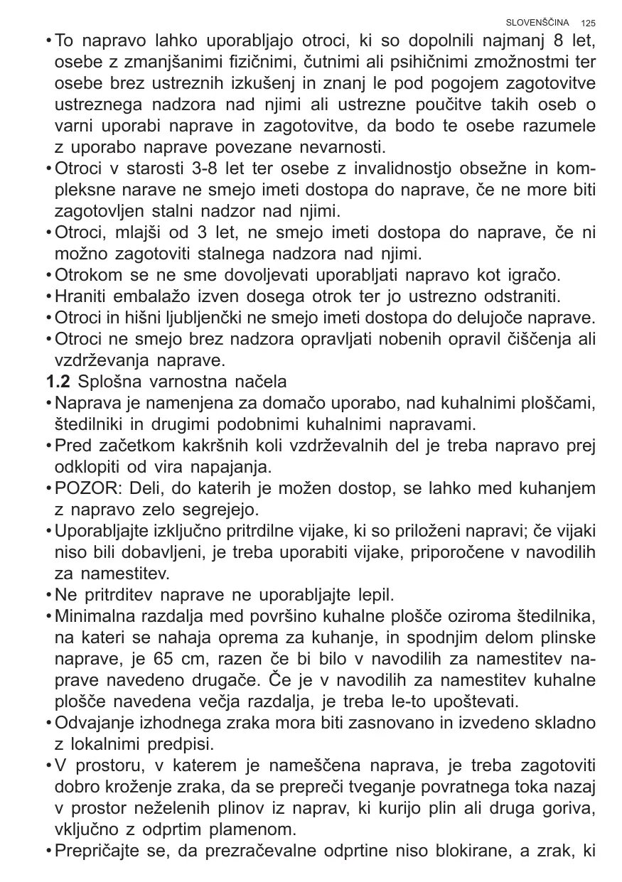 • Les enfants âgés de 3 à 8 ans et les personnes handicapées de manière étendue et complexe ne peuvent pas avoir accès à l’appareil s’ils ne peuvent pas bénéficier d’une surveillance constante. • Les enfants de moins de 3 ans ne doivent pas avoir accès à l’appareil s’ils ne peuvent pas être surveillés en permanence. • Les enfants ne doivent pas utiliser l’appareil en tant que jouet. • Protégez les emballages des enfants et éliminez-les de manière appropriée. • Les enfants et les animaux domestiques ne doivent pas avoir accès à l’appareil en état de fonctionnement. • Les enfants ne doivent pas effectuer le nettoyage ou l’entretien de l’appareil sans surveillance. 1.2 Règles générales de sécurité • L’appareil est destiné à un usage domestique, au-dessus des fours, cuisinières et autres appareils de cuisson similaires. • Avant d’effectuer tout travail de maintenance, l’appareil doit être déconnecté de l’alimentation électrique. • AVERTISSEMENT : Les parties auxquelles l’accès peut être obtenu peuvent devenir chaudes pendant l’utilisation avec des appareils de cuisson. • Utilisez uniquement les vis de montage fournies avec l’appareil; si elles n’ont pas été livrées, utilisez les vis recommandées dans la notice d’installation. • N’utilisez pas d’adhésifs pour fixer l’appareil. • La distance minimale entre la surface de la plaque de cuisson sur laquelle se trouvent les ustensiles de cuisson et la partie inférieure de l’appareil à gaz doit être de 65 cm, sauf indication contraire dans la notice d’installation. Si une plus grande distance a été spécifiée dans la notice d’installation de la plaque de cuisson, cela doit être