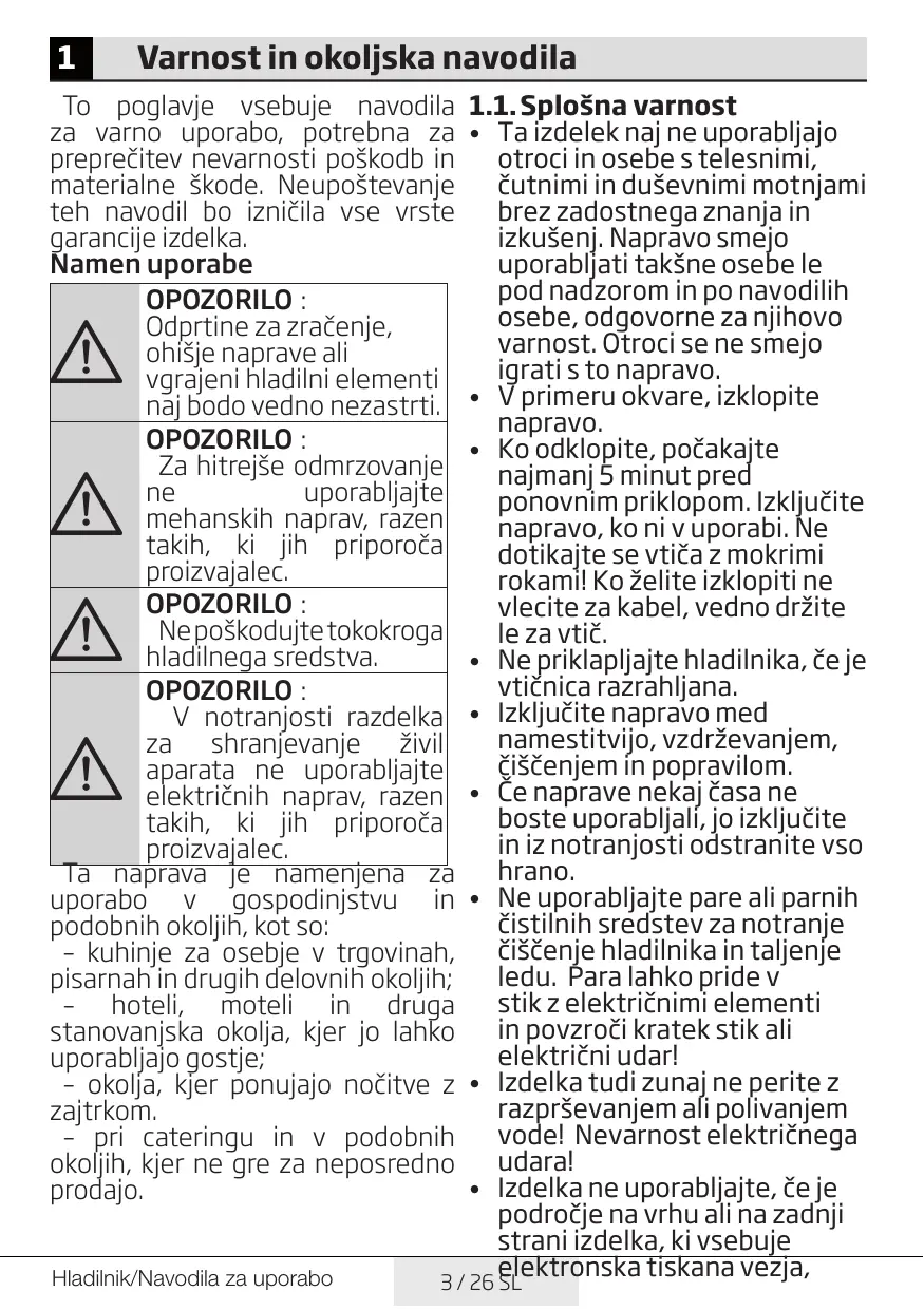 To poglavje vsebuje navodila za varno uporabo, potrebna za preprečitev nevarnosti poškodb in materialne škode. Neupoštevanje teh navodil bo izničila vse vrste garancije izdelka. Namen uporabe OPOZORILO : Odprtine za zračenje, ohišje naprave ali vgrajeni hladilni elementi naj bodo vedno nezastrti. OPOZORILO : Za hitrejše odmrzovanje ne uporabljajte mehanskih naprav, razen takih, ki jih priporoča proizvajalec. OPOZORILO : Ne poškodujte tokokroga hladilnega sredstva. OPOZORILO : V notranjosti razdelka za shranjevanje živil aparata ne uporabljajte električnih naprav, razen takih, ki jih priporoča proizvajalec. Ta naprava je namenjena za uporabo v gospodinjstvu in podobnih okoljih, kot so: – kuhinje za osebje v trgovinah, pisarnah in drugih delovnih okoljih; – hoteli, moteli in druga stanovanjska okolja, kjer jo lahko uporabljajo gostje; – okolja, kjer ponujajo nočitve z zajtrkom. – pri cateringu in v podobnih okoljih, kjer ne gre za neposredno prodajo.
