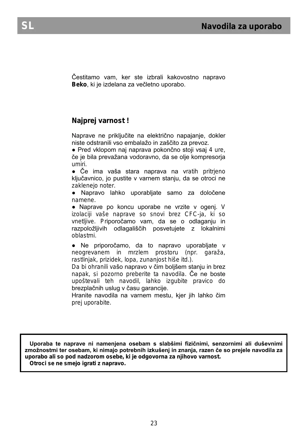 Najprej varnost ! Naprave ne priključite na električno napajanje, dokler niste odstranili vso embalažo in zaščito za prevoz. ● Pred vklopom naj naprava pokončno stoji vsaj 4 ure, če je bila prevažana vodoravno, da se olje kompresorja umiri. ● Če ima vaša stara naprava na vratih pritrjeno ključavnico, jo pustite v varnem stanju, da se otroci ne zaklenejo noter. ● Napravo lahko uporabljate samo za določene namene. ● Naprave po koncu uporabe ne vrzite v ogenj. V izolaciji vaše naprave so snovi brez CFC-ja, ki so vnetljive. Priporočamo vam, da se o odlaganju in razpoložljivih odlagališčih posvetujete z lokalnimi oblastmi. ● Ne priporočamo, da to napravo uporabljate v neogrevanem in mrzlem prostoru (npr. garaža, rastlinjak, prizidek, lopa, zunanjost hiše itd.). Da bi ohranili vašo napravo v čim boljšem stanju in brez napak, si pozorno preberite ta navodila. Če ne boste upoštevali teh navodil, lahko izgubite pravico do brezplačnih uslug v času garancije. Hranite navodila na varnem mestu, kjer jih lahko čim prej uporabite.
