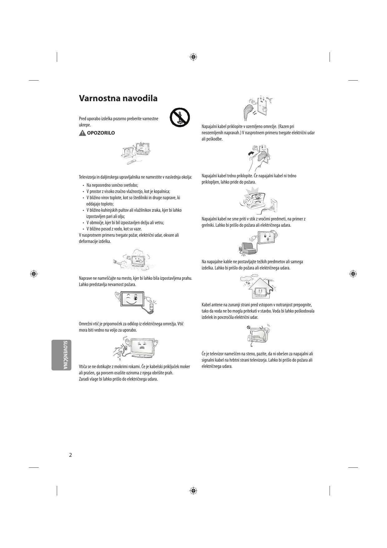 Če je televizor nameščen na steno, pazite, da ni obešen za napajalni ali signalni kabel na hrbtni strani televizorja. Lahko bi prišlo do požara ali električnega udara. Ne priklopite preveč električnih naprav na en sam razdelilnik. Lahko bi prišlo do požara zaradi pregrevanja. Če je en konec napajalnega kabla priključen v stensko vtičnico, v drugi konec ne vstavljajte prevodnikov (kot je kovinska paličica). Poleg tega se ne dotaknite napajalnega kabla tik po tem, ko ga vstavite v vtičnico. S tem bi tvegali električni udar. (Odvisno od modela) Pazite, da vam izdelek med priklopom zunanjih naprav ne pade. Lahko bi prišlo do telesnih poškodb ali škode na izdelku. Blizu naprave ne postavljajte ali hranite vnetljivih snovi. Neprevidno ravnanje z vnetljivimi snovmi lahko privede do eksplozije ali požara. Snovi za vpijanje vlage ali vinilno embalažo hranite zunaj dosega otrok. Snovi za vpijanje vlage so strupene, če jih zaužijete. V primeru nenamernega zaužitja pacienta prisilite k bruhanju in odpeljite v najbližjo bolnišnico. Vinilna embalaža predstavlja tveganje zadušitve. Hranite jo zunaj dosega otrok. V izdelek ne vstavljajte kovinskih predmetov, na primer kovancev, lasnih igel, paličic in žic, ali vnetljivih predmetov, na primer papirja ali vžigalic. Še zlasti bodite previdni v prisotnosti otrok. Lahko bi prišlo do električnega udara, požara ali poškodb. Če v izdelek pade predmet, izključite napajalni kabel in se obrnite na servisni center. Otrokom ne pustite plezanja ali obešanja na televizor. Televizor bi se lahko prevrnil in povzročil hude poškodbe. Izdelka ne škropite z vodo ali ga čistite z vnetljivimi sredstvi (razredčila ali benzen). Lahko bi prišlo do požara ali električnega udara. Izrabljene baterije zavrzite odgovorno, da jih ne bo mogel zaužiti otrok. Če jih otrok vendarle zaužije, nemudoma poiščite zdravniško pomoč. SLOVENŠČINA Izdelka ne izpostavljajte udarcem, vanj ne vstavljajte predmetov in ne tolcite po zaslonu. Sicer lahko pride do električnega udara ali poškodb izdelka.