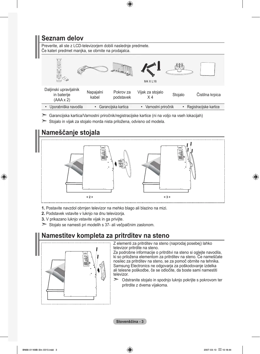 - Če je na zaslonu dlje časa prikazana mirujoča računalniška slika ali slika iz video igrice, to lahko povzroči delni prikaz zakasnele slike. Ta učinek preprečite tako, da ob prikazu mirujočih slih zmanjšate svetlost in kontrast. © 2007 Samsung Electronics Co., Ltd. All rights reserved. BN68-01169B-Sln-0313.indd 1 2007-03-13 10:18:41 Vsebina