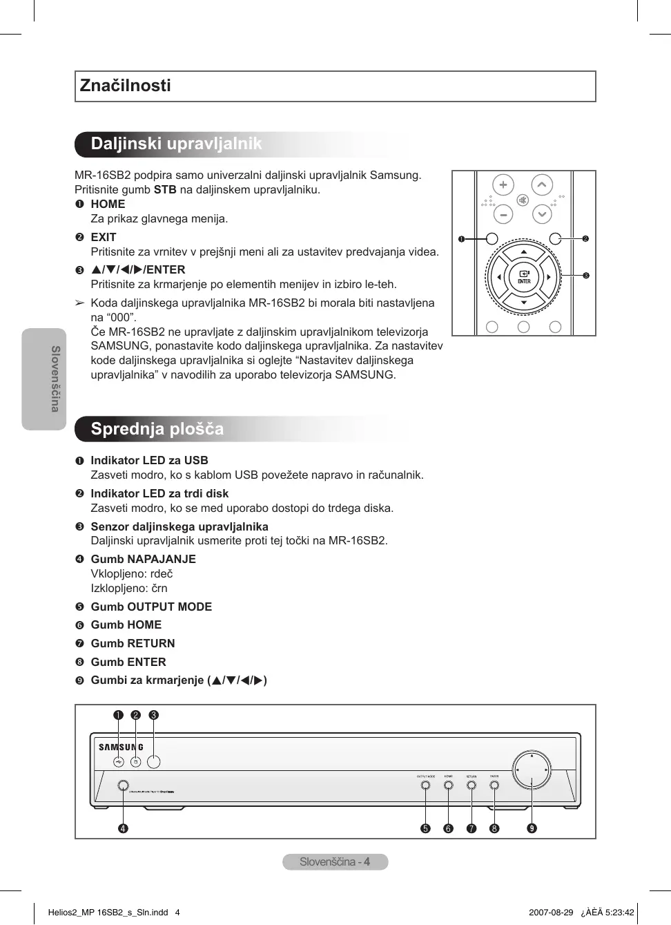 Značilnosti Daljinski upravljalnik MR-16SB2 podpira samo univerzalni daljinski upravljalnik Samsung. Pritisnite gumb STB na daljinskem upravljalniku. HOME Za prikaz glavnega menija. EXIT Pritisnite za vrnitev v prejšnji meni ali za ustavitev predvajanja videa. ////ENTER Pritisnite za krmarjenje po elementih menijev in izbiro le-teh.